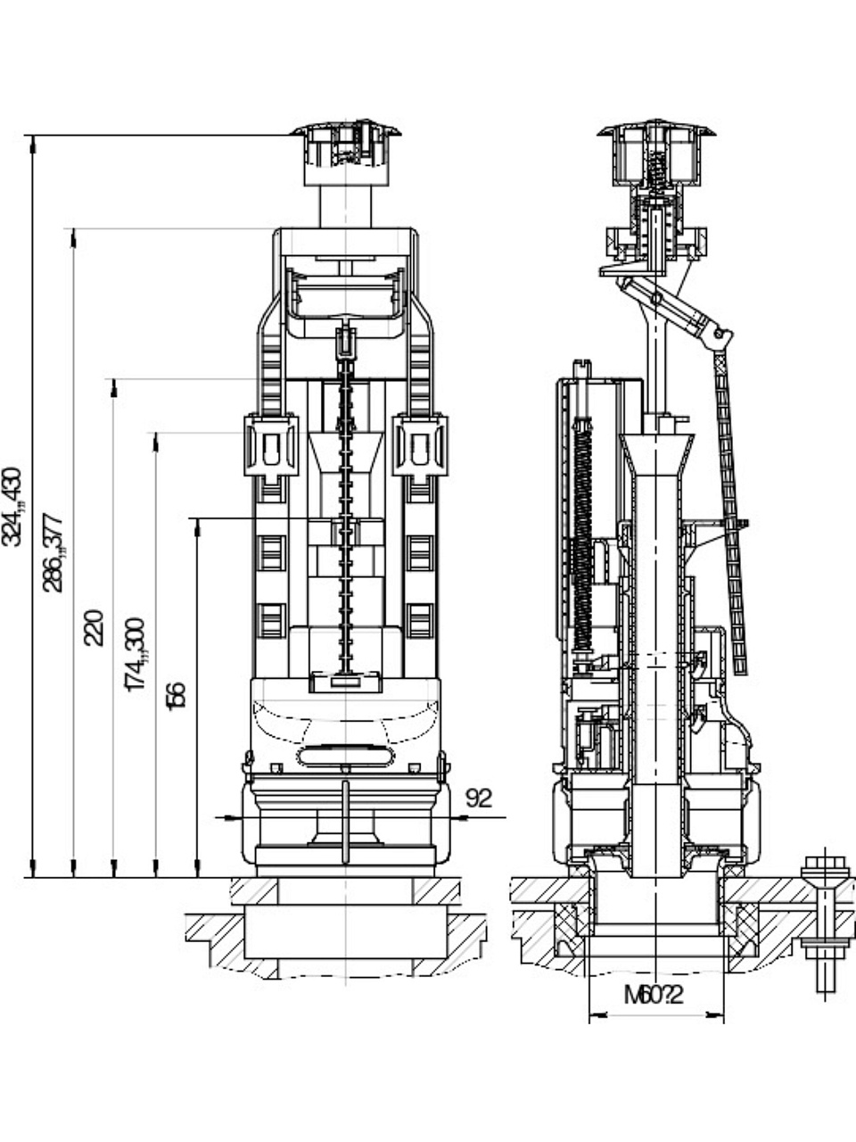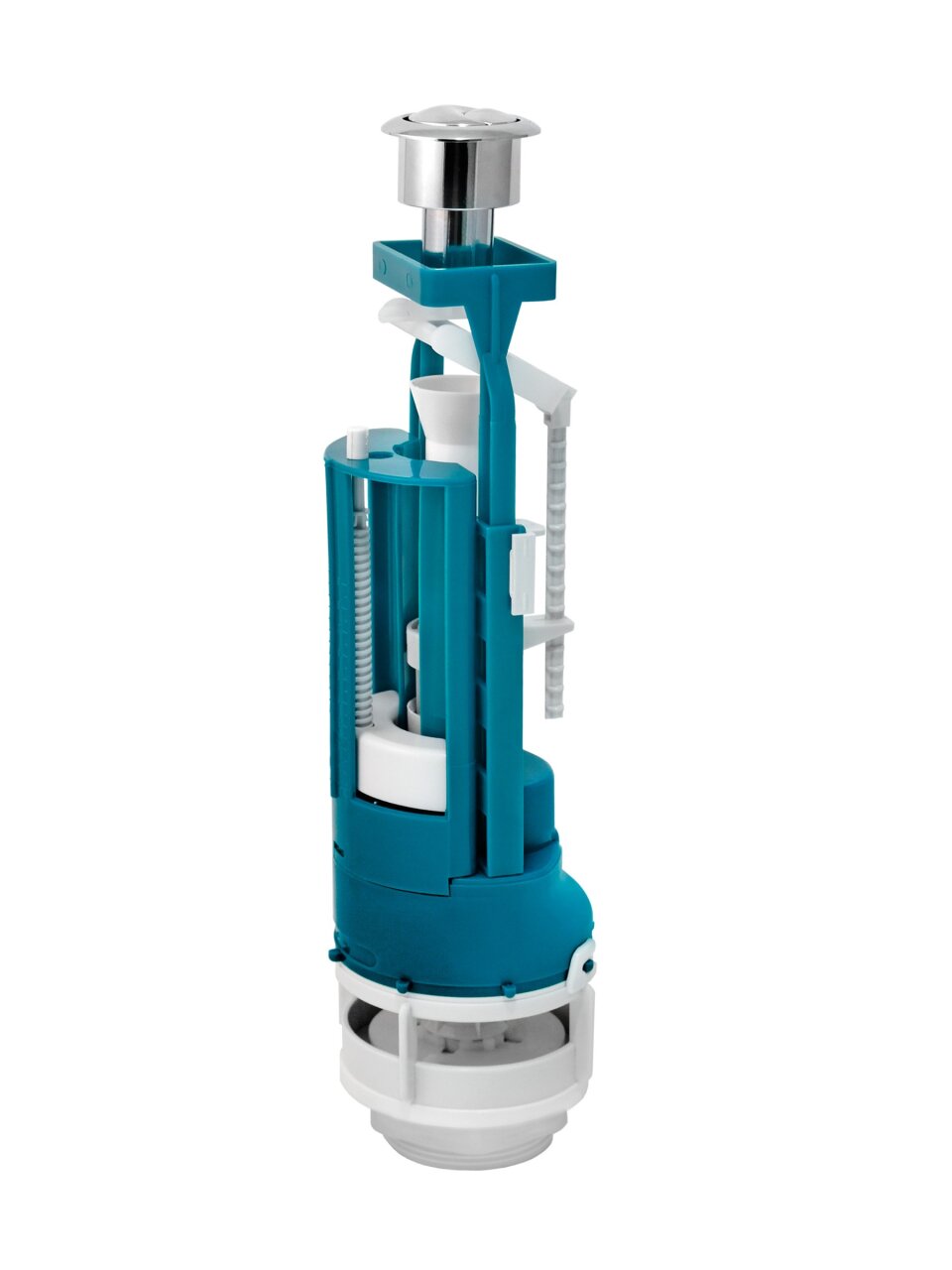 Арматура-комплект предназначена для установки в бачок унитаза, для наполнения и подачи воды на смыв в унитаз. Приспособление выполнено из пластика. Арматура с боковой подводкой оснащена кнопкой с двумя режимами для полного слива бачка и частичного для экономии воды.