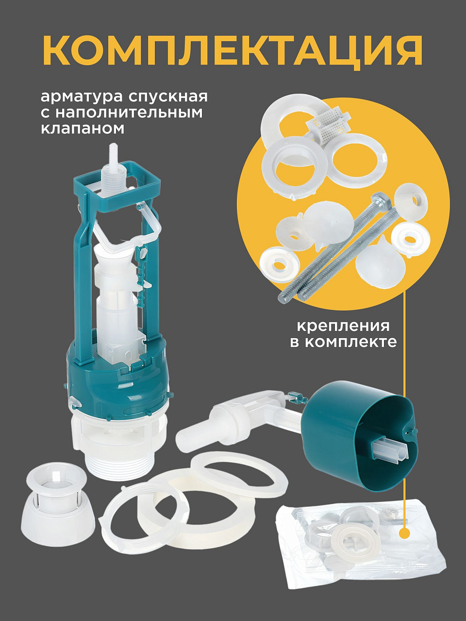 - Комплектация: с арматурой в комплекте (в комплектацию к арматуре входит прокладка между бачком и унитазом, болты для крепления).