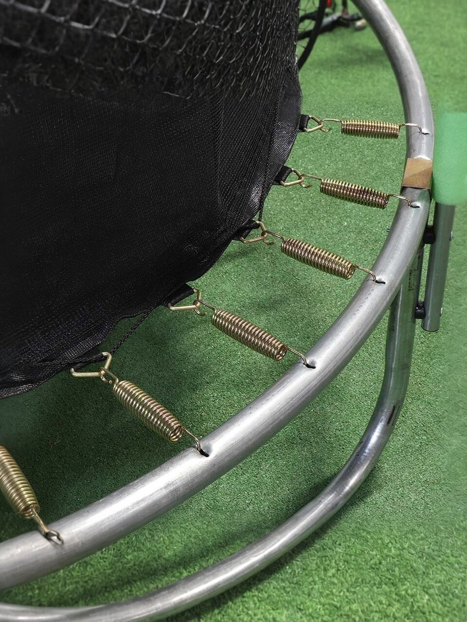 Конструкция для обеспечения безопасности выполнена из стали, диаметр стальных труб 38 мм, толщина металла 1,2 мм. В конструкции 3 опоры (ноги) из стали диаметром 38 мм, толщина металла 1,1 мм. Дуги сбоку из стали диаметром 25 мм, толщина металла 1,1 мм, покрытые защитным материалом ПВХ 310 г/м+вспененный полиэтилен 10 мм, количество дуг - 6. Пружины 42 шт диаметром 3х130 мм.