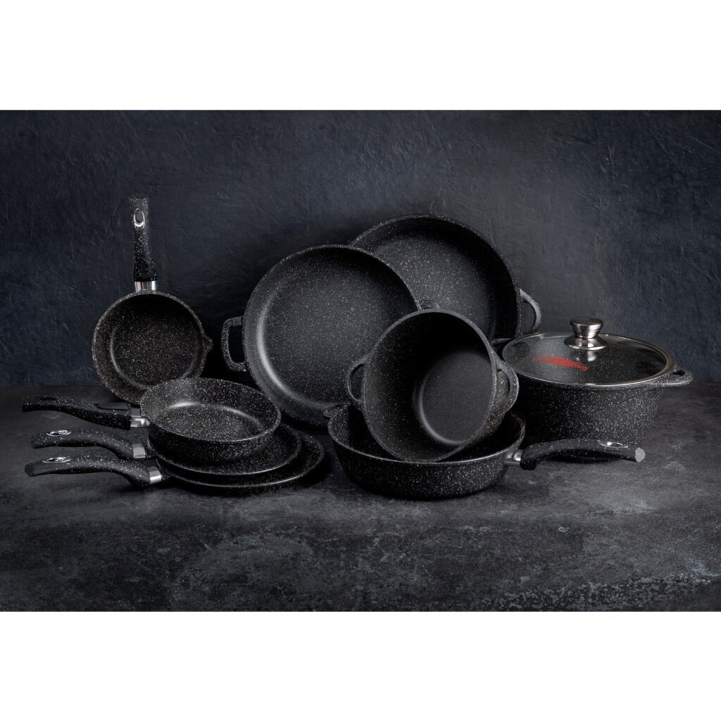 Сковорода изготовлена из пищевого алюминия и покрыта двойным слоем антипригарного покрытия Greblon Мрамор, немецкого производства. Дно толщиной 4 мм равномерно прогревается и не деформируется. Чтобы блины легко отставали, сковородку достаточно смазать тонким слоем масла. Удобная бакелитовая ручка не нагревается. Блины удобно снимать благодаря низким бортам, расположенным под острым углом по отношению ко дну. Сковорода подходит для газовых, электрических и стеклокерамических плит.