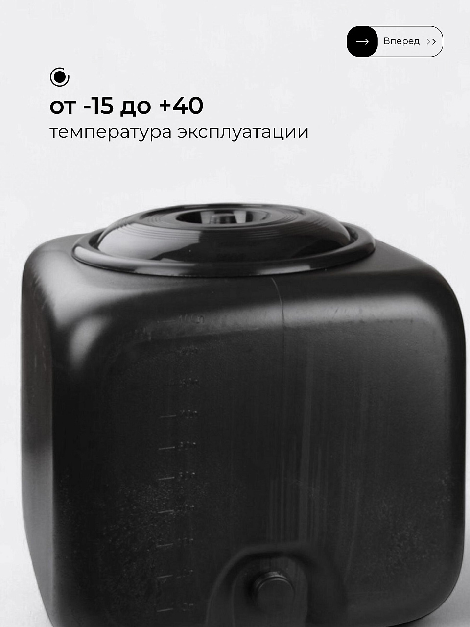 - Уникальная форма: квадратный бак легко размещается на любой поверхности, экономит место и устойчив даже на небольшой площадке.