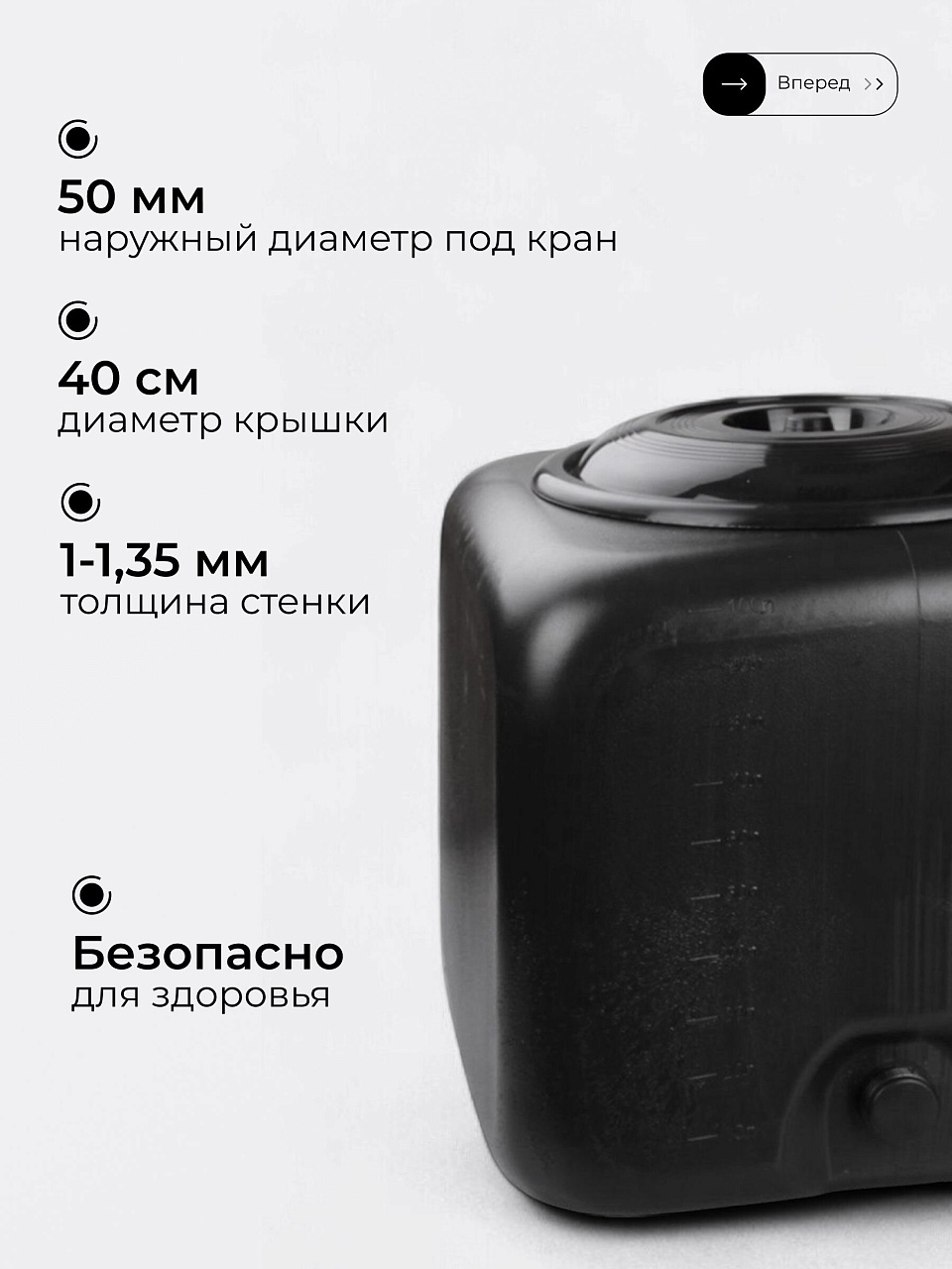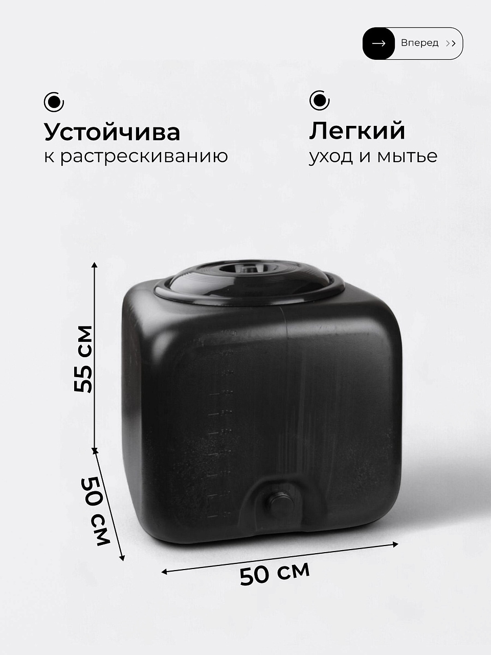 Длина, ширина и высота — по 50 см, объём — 100 литров. Квадратная форма облегчает установку на душевую кабину или любую ровную поверхность.