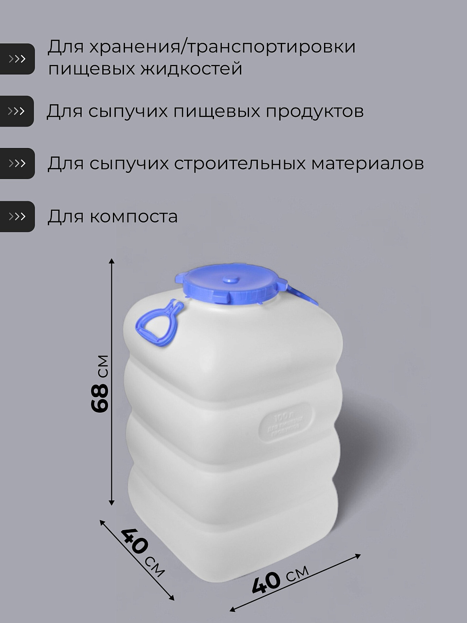 Идеальна для хранения питьевой воды, солений, овощей, круп, жидкостей и других пищевых продуктов. Можно использовать на даче, в доме, для перевозки урожая.