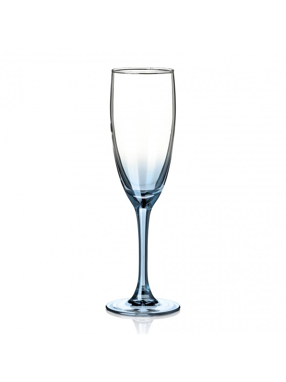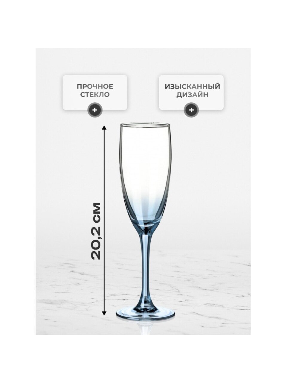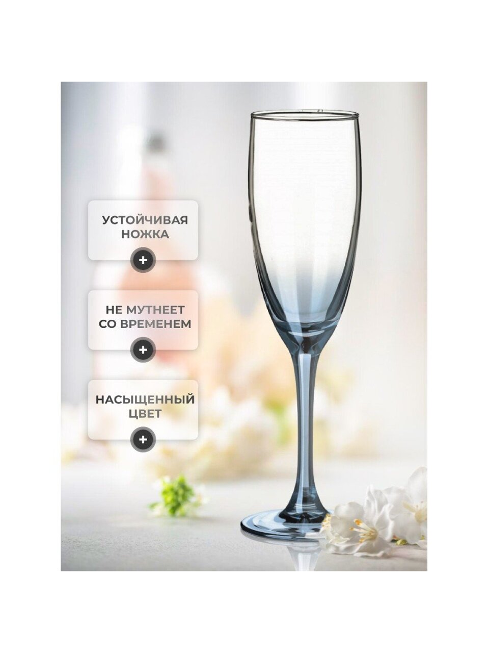 Каждый бокал рассчитан на 170 мл, выполнен в форме флютте из гладкого выдувного стекла с синим омбре-оттенком, подходит для шампанского и игристых вин.