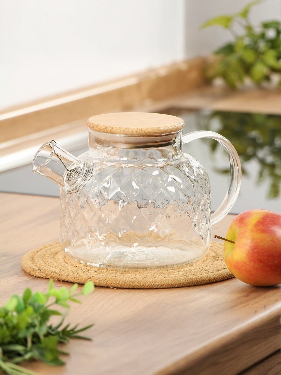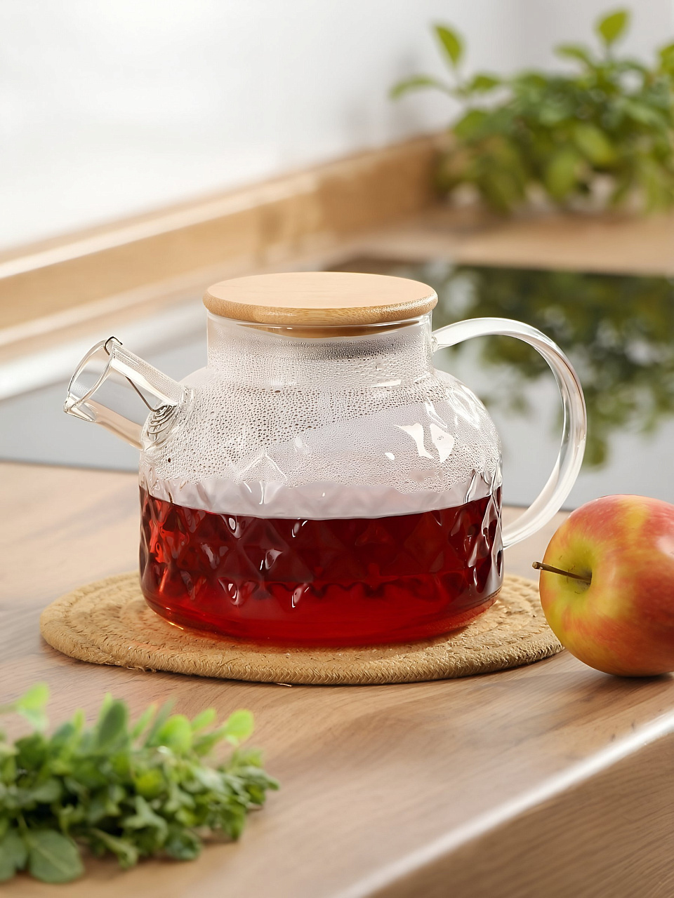 Чайник оснащен удобным ситечком, что позволяет заваривать чай без лишних хлопот, сохраняя чистоту и насыщенность вкуса. Круглая форма и стеклянная ручка обеспечивают комфортное использование, а крышка сохраняет температуру напитка дольше, позволяя наслаждаться горячим чаем в любое время.