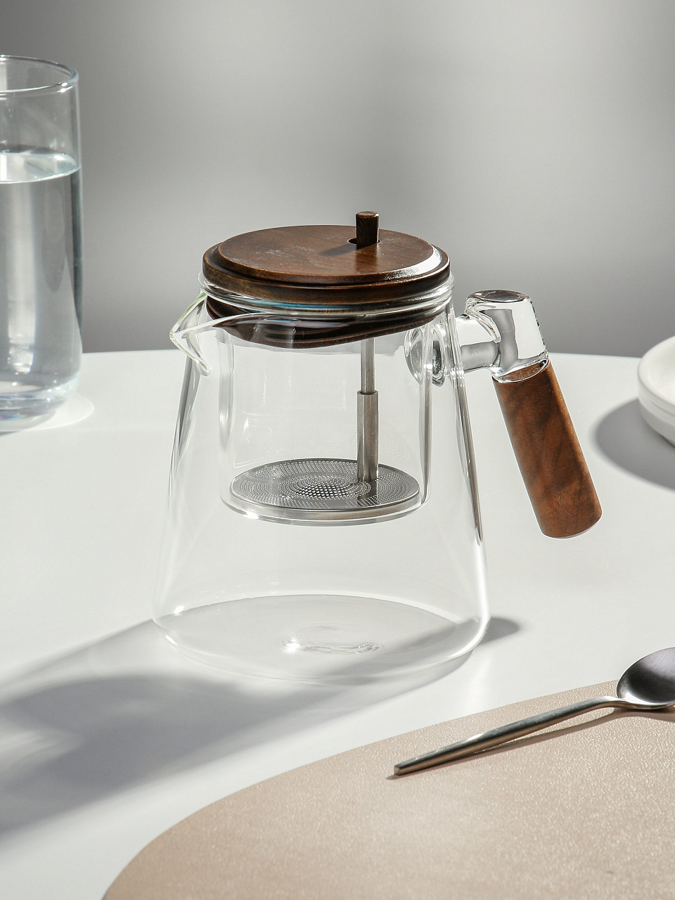 Крышка и ручка выполнены из натурального дерева, корпус — из прозрачного стекла, фильтр — из нержавеющей стали.