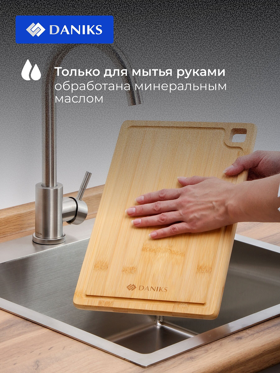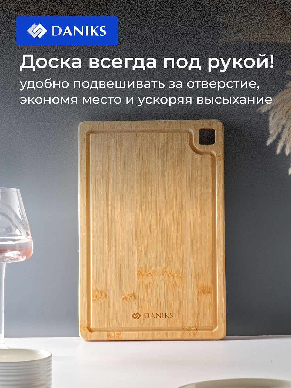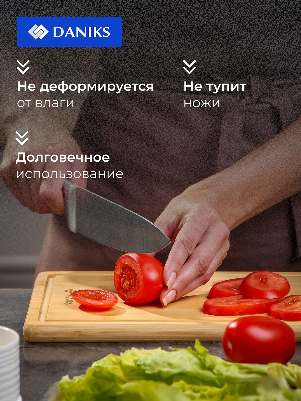 Разделочная доска из бамбука легкая и ее удобно держать в руке во время использования, устойчива к повреждениям, не деформируется при эксплуатации.