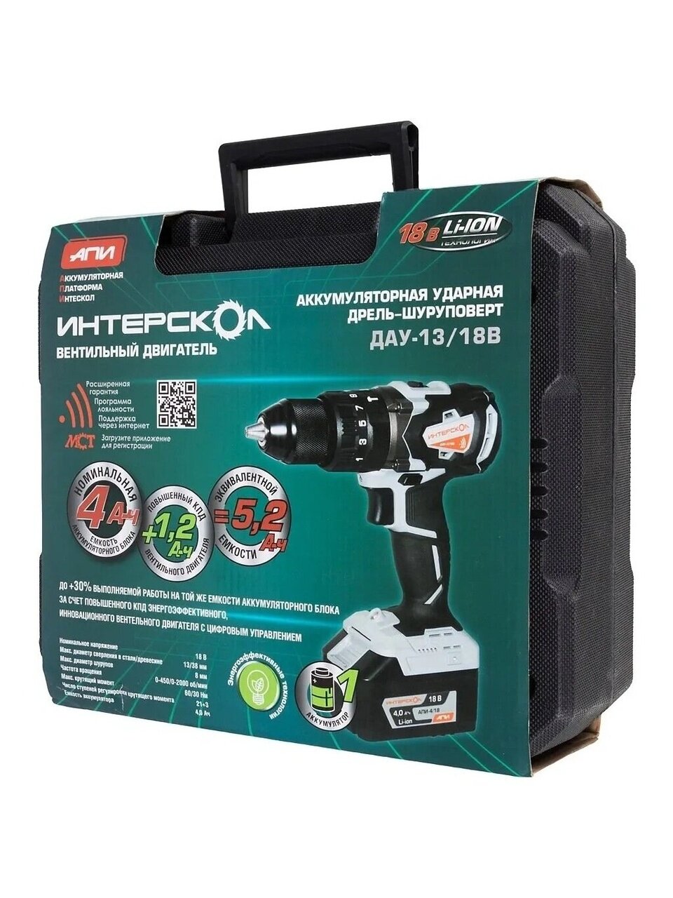 Дрель-шуруповерт оснащена Li-ion слайдерным аккумуляторным блоком платформы АПИ.