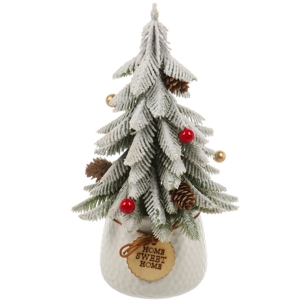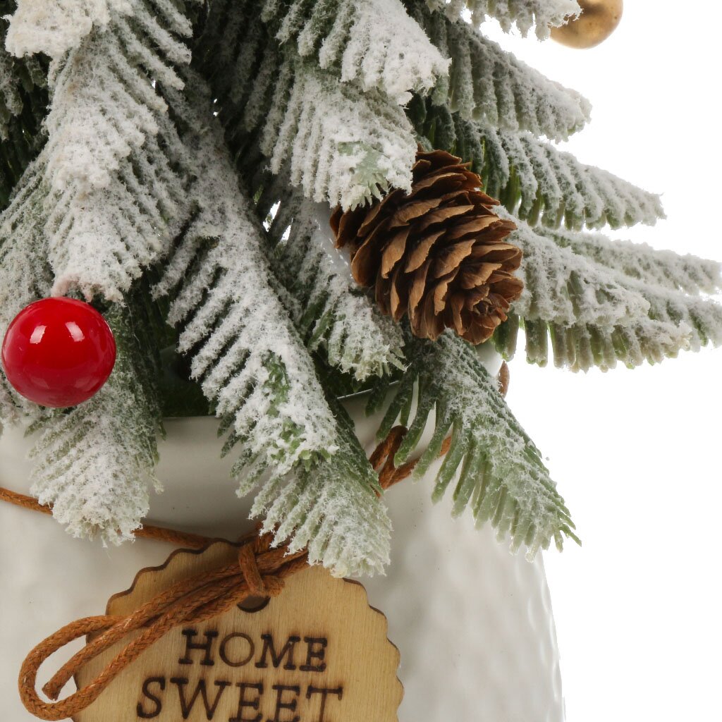 Высота елки — 29 см, конструкция неразборная, крепление веток — разгибающийся тип, дерево — ель, форма — классическая, декор — заснеженность, ягоды, шишки, подставка — горшок из полимера.
