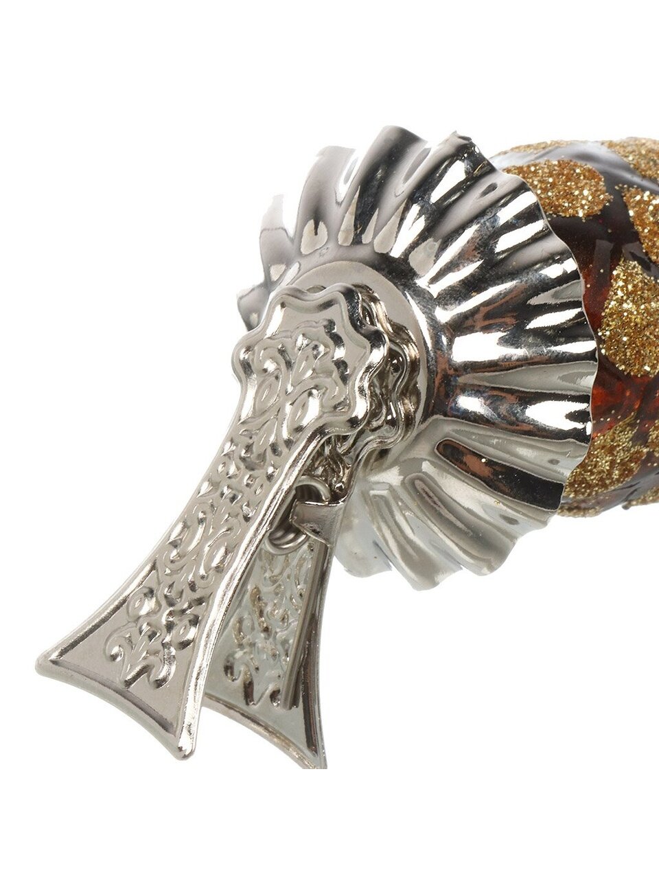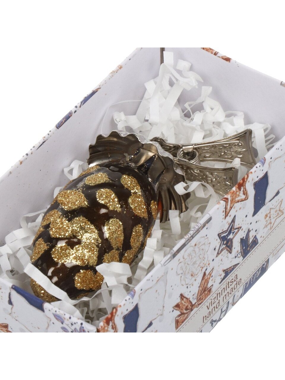 Высота — 8 см, материал — стекло с ручной росписью и блестками, цвет — коричневый, крепление — прищепка.