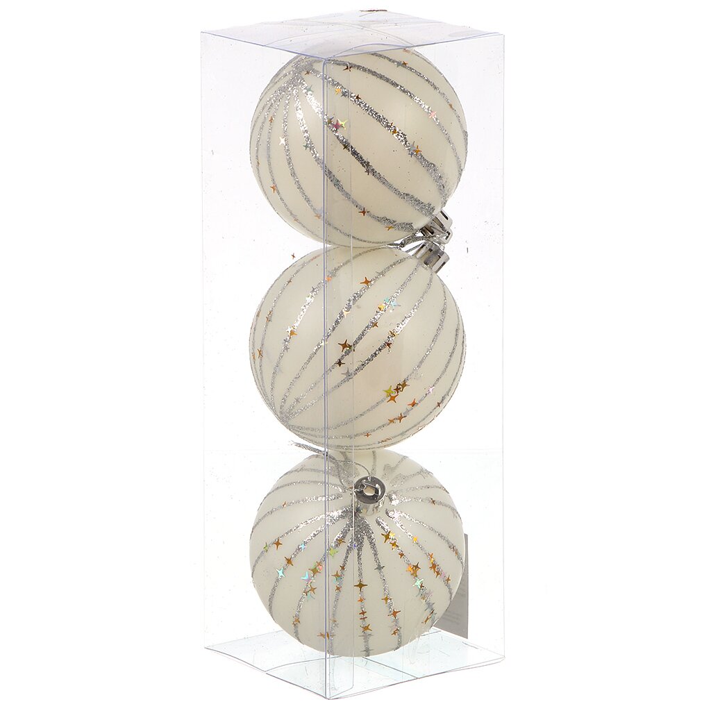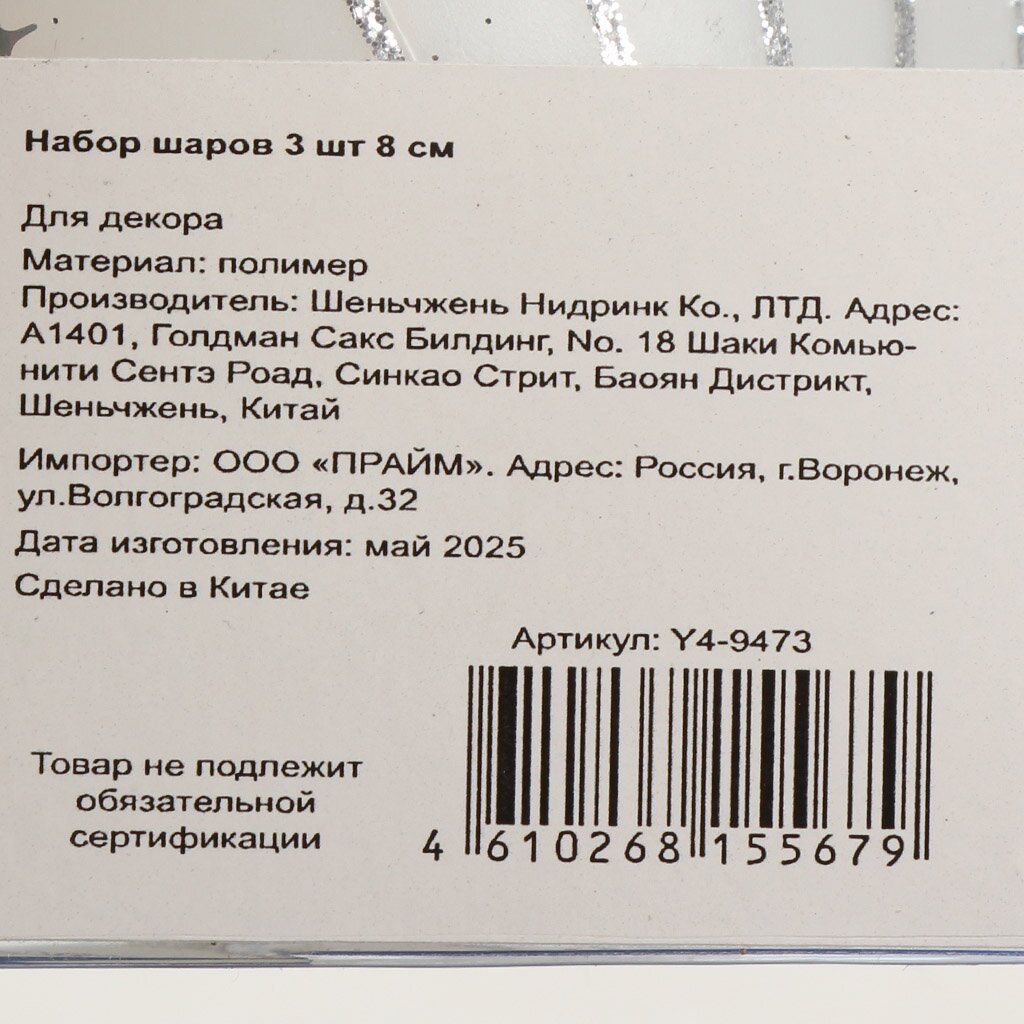 Набор шаров 3 шт, белый с серебром, 8 см — стильное и безопасное украшение для ёлки, дома или улицы. Не бьются, подходят для подарка и семейного декора.