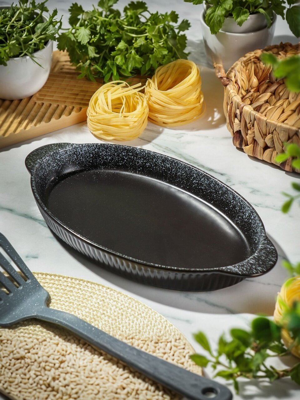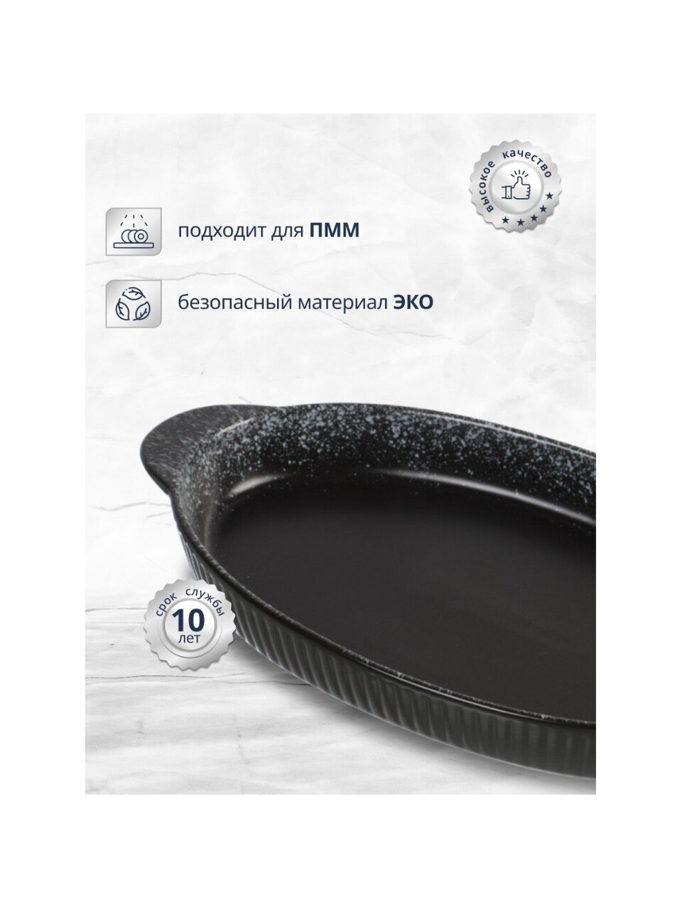 - Практичность и долговечность: жаропрочная керамика выдерживает высокие температуры, размеры 31,5×16,5×2,5 см оптимальны для семейных блюд, объем — 0,7 л.