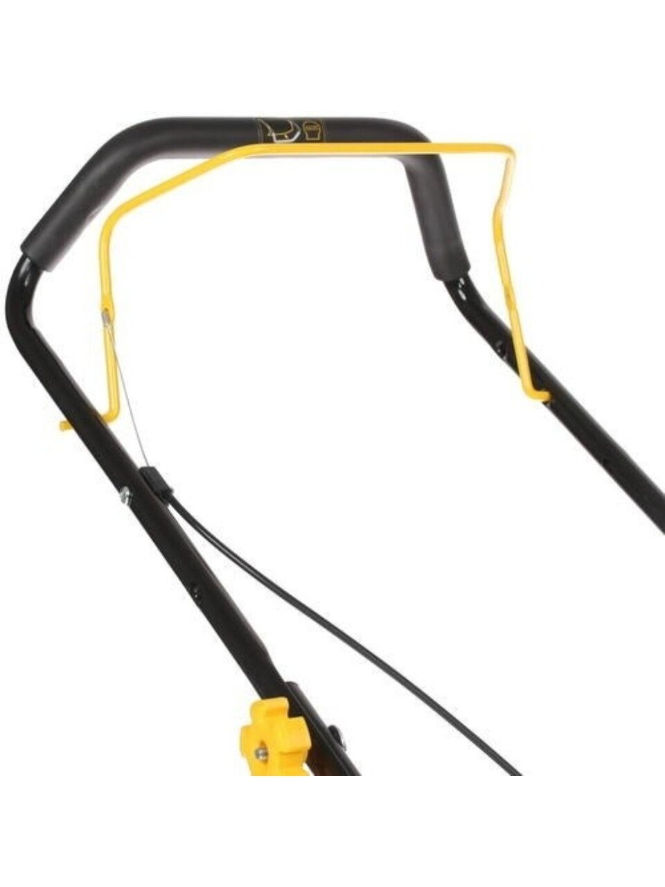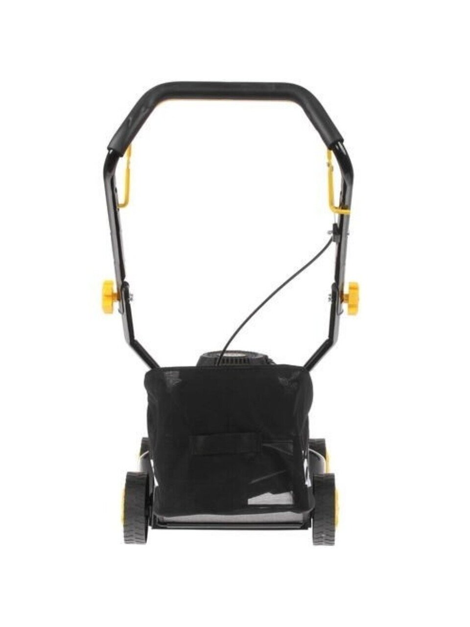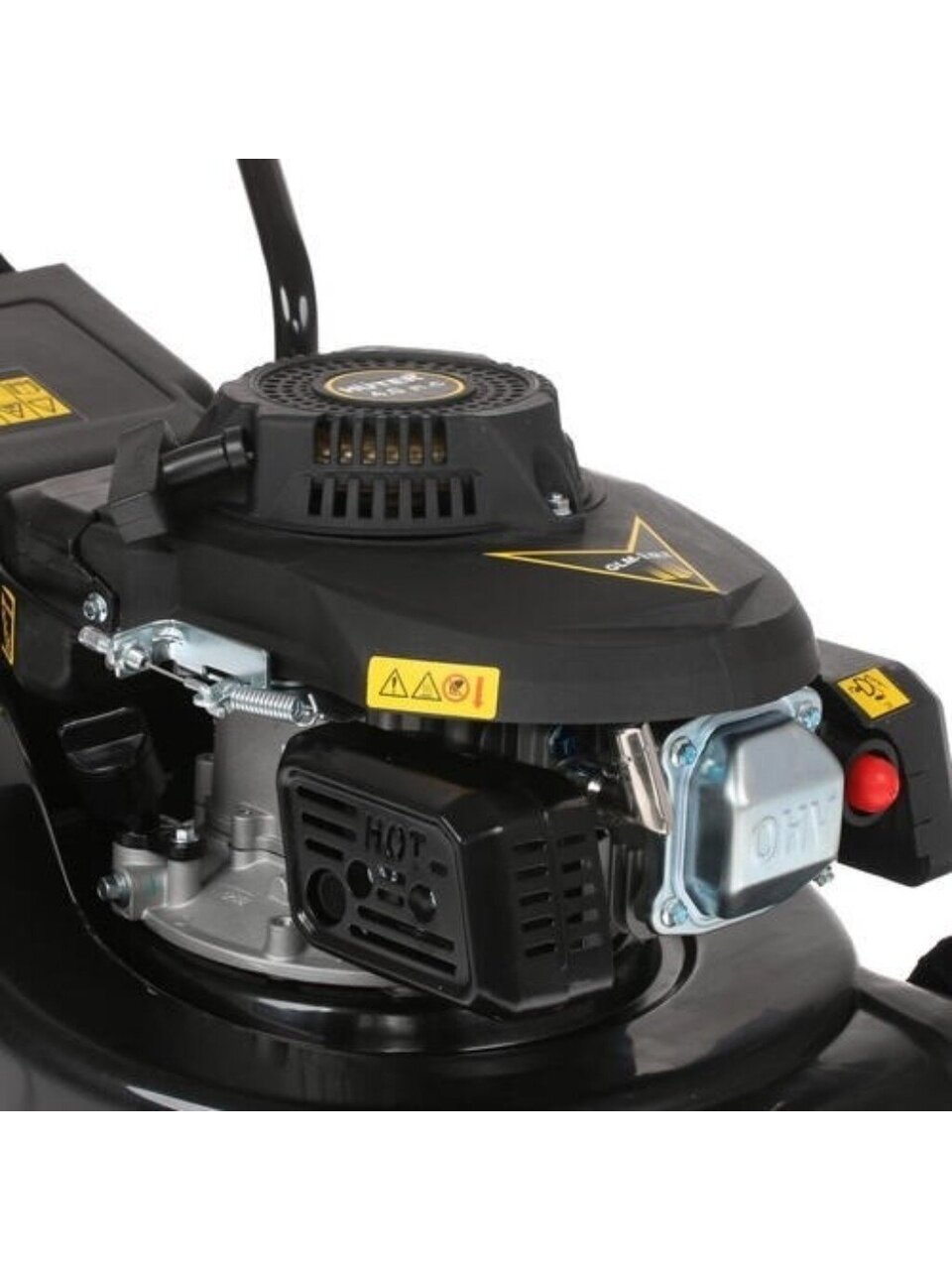 - Газонокосилка оснащена двигателем мощностью 4 л. с., что позволяет ей справляться с различными видами газонных покрытий, включая высокую траву и участки с неровной поверхностью.