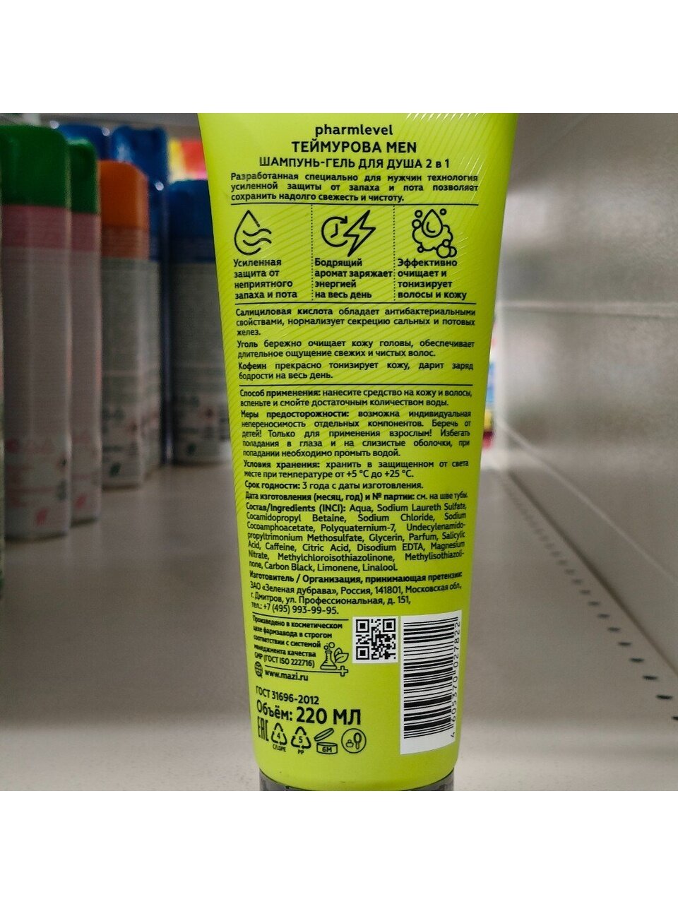 Гель для душа и шампунь Pharmlevel ТЕЙМУРОВА - разработанная специально для мужчин технология усиленной защиты от запаха и пота позволяет сохранить надолго свежесть и чистоту.