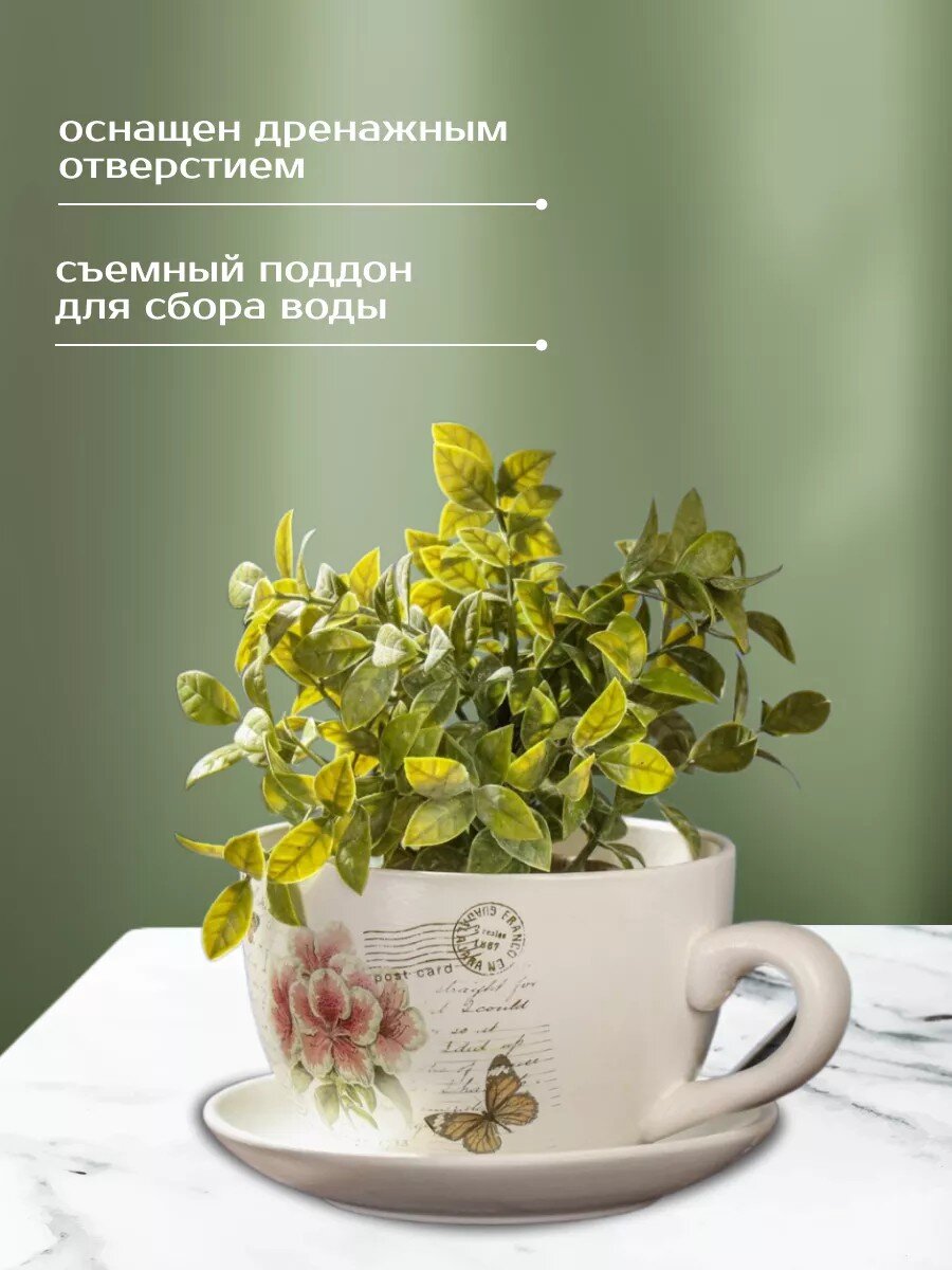 Креативный горшок из керамики выполнен в виде чашки с блюдцем. Оригинальная форма и высокая функциональность рождают интересное сочетание, которое понравится поклонникам нестандартных решений и практичности одновременно. А вместительный поддон поможет не беспокоиться о вылившейся на подоконник грязной воде.