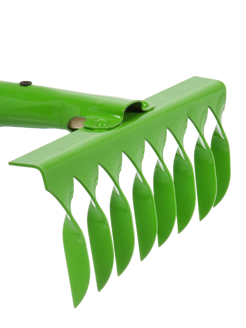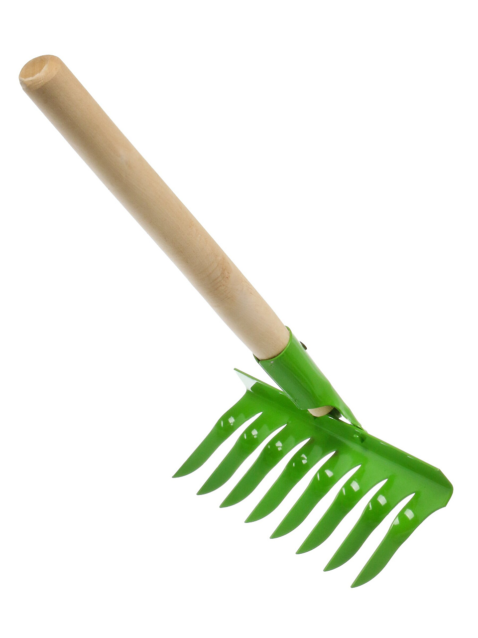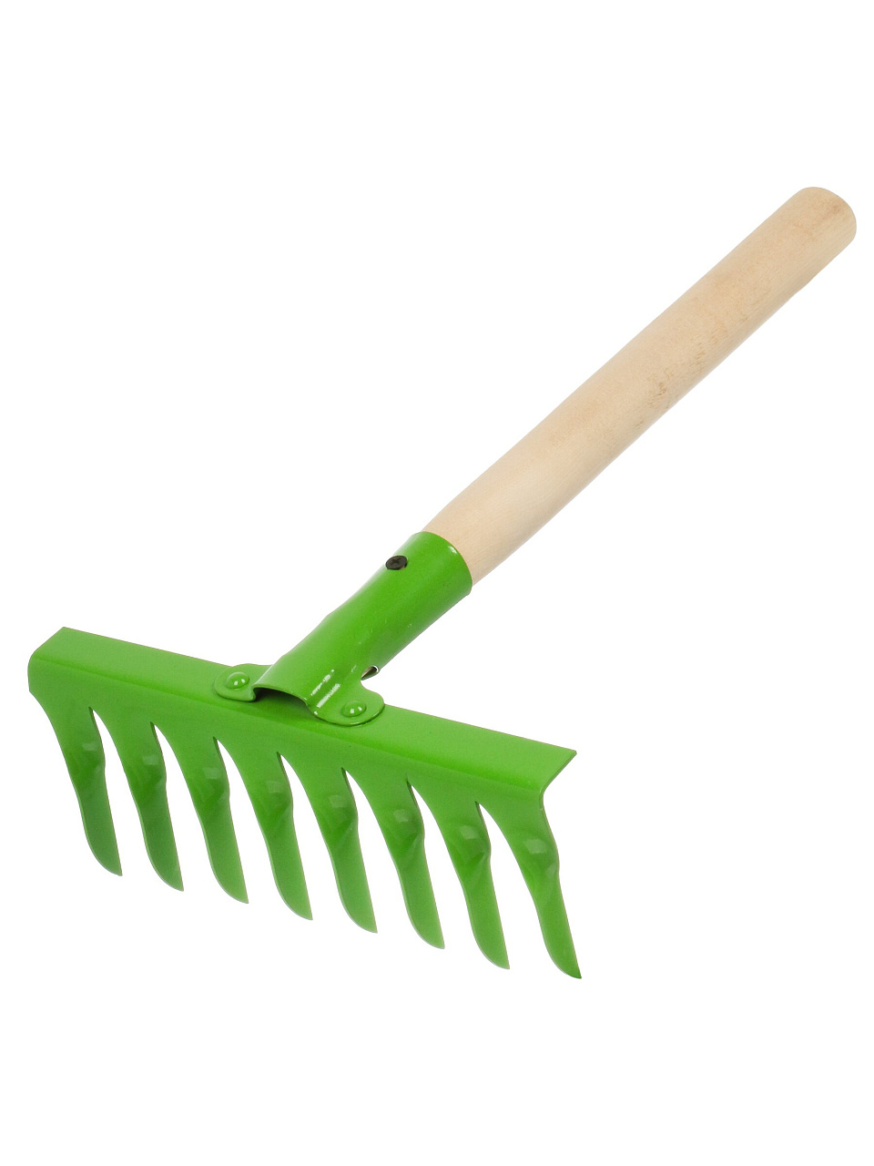 - 8 стальных зубцов — эффективно собирают листву, скошенную траву и мусор; прочный деревянный черенок удобно лежит в руке