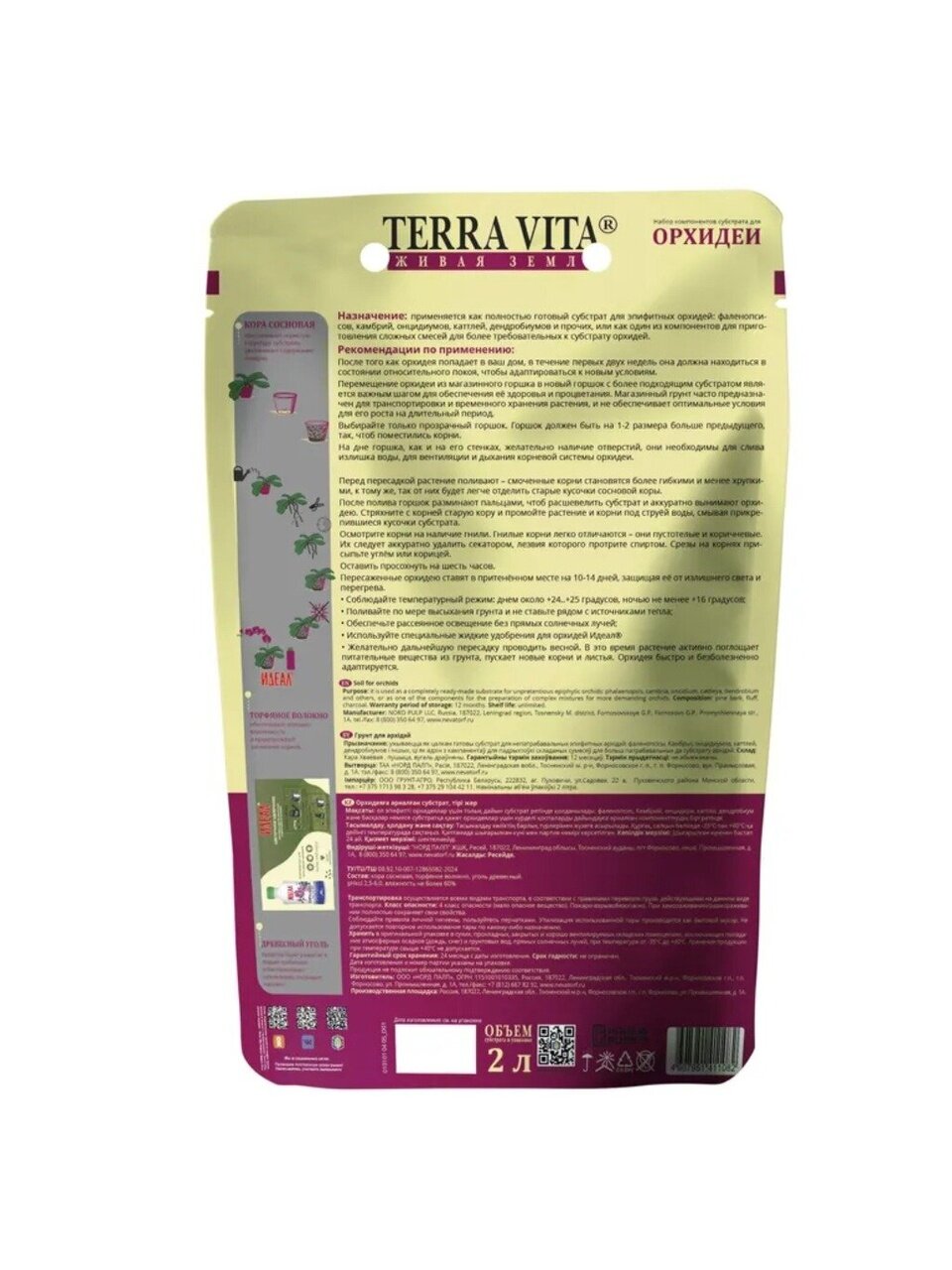 Откройте для себя идеальный грунт для орхидей с Terra Vita! Этот субстрат объемом 2 литра создан специально для эпифитных орхидей: фаленопсисов, камбрий, онцидиумов и дендробиумов. Весной и осенью, когда растения требуют особого ухода, грунт обеспечит необходимую аэрацию и обогащение почвы. Состав включает кору сосновую, торф и древесный уголь, что гарантирует оптимальные условия для роста и цветения ваших орхидей.