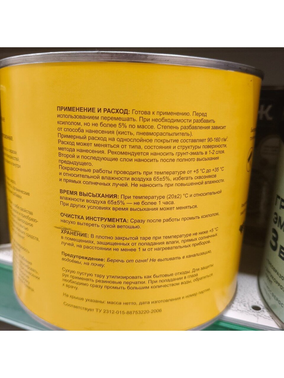 Применение и расход: Готова к применению. Перед использованием перемешать. При необходимости разбавить ксилолом, но не более 5 % по массе. Степень разбавления зависит от способа нанесения (кисть, пневмораспылитель). Примерный расход на однослойное покрытие составляет 90-160 г/м2. Расход может меняться от типа, состояния, структуры поверхности, метода нанесения. Рекомендуется наносить грунт-эмаль в 1-2 слоя. Второй и последующие слои наносить после полного высыхания предыдущего. Покрасочные работы проводить при температуре от +15 С до +35 С и относительной влажности воздуха 65 %, избегать сквозняков и прямых солнечных лучей.