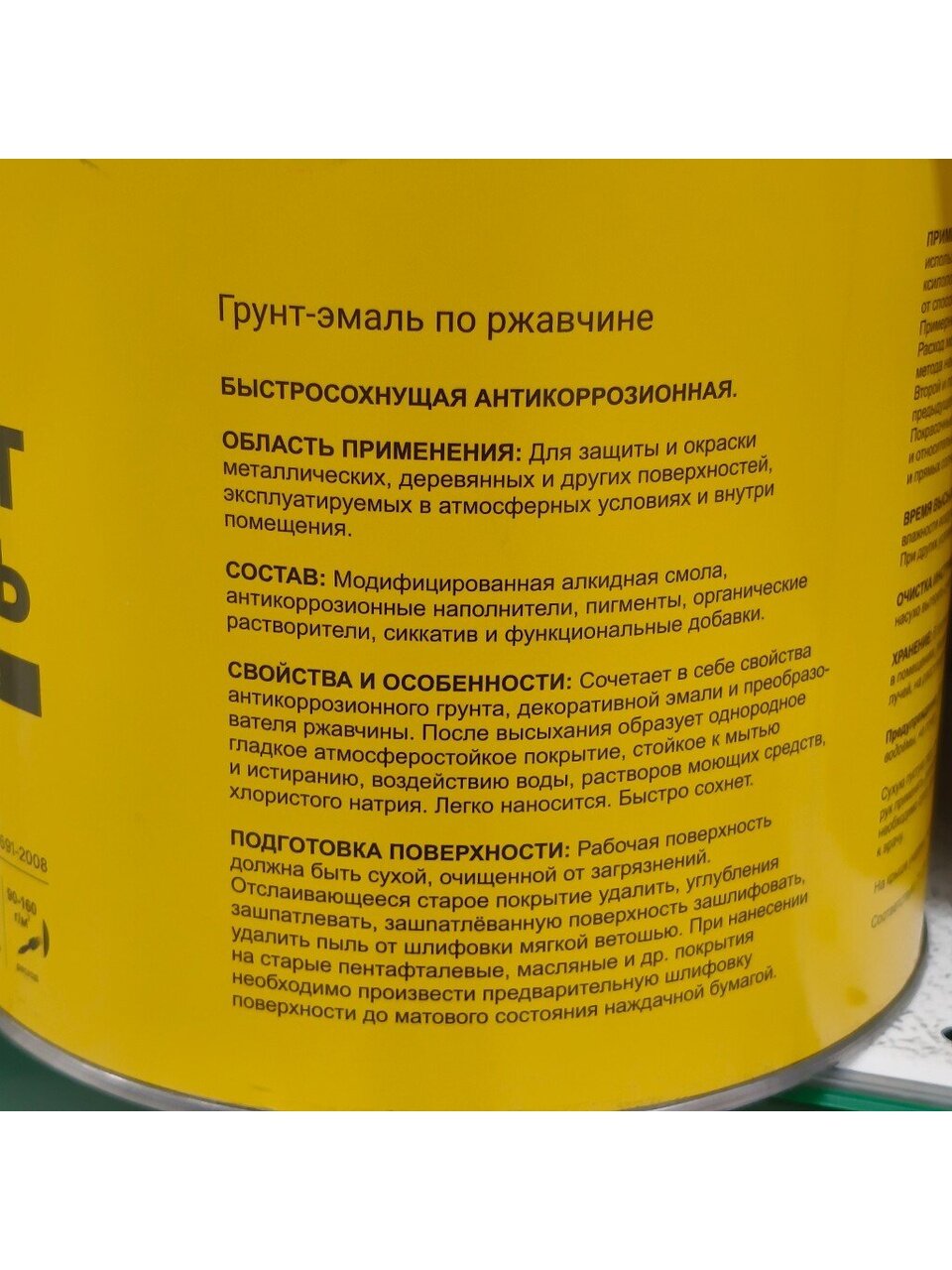 Свойства и особенности: сочетает в себе свойства антикоррозионного грунта, декоративной эмали и преобразователи ржавчины. После высыхания образует однородное, гладкое, атмосферостойкое покрытие, стойкое к мытью и истиранию, воздействию воды, растворов моющих средств, хлористого натрия. Легко наносится. Быстро сохнет.