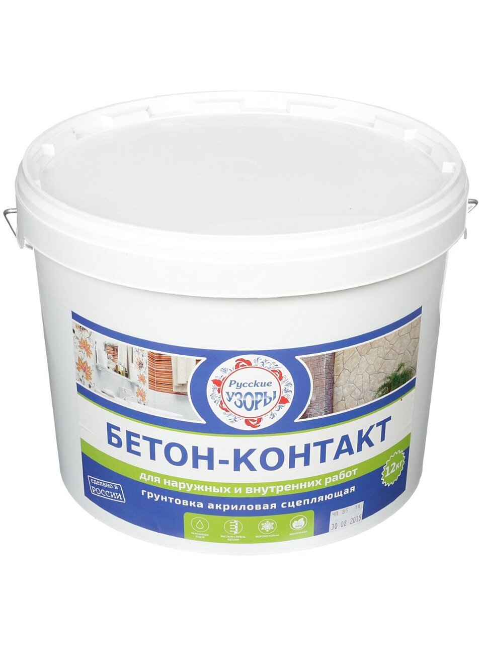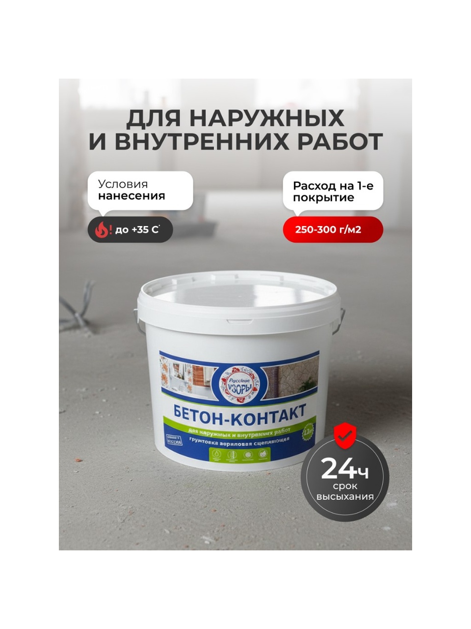Грунтовка для наружных и внутренних работ на основе акриловых полимеров Русские узоры - готовая к применению адгезионная грунтовка для работ по бетону. За счет объемного наполнителя, после высыхания, создает шероховатую поверхность, чтобы на бетон можно было наносить последующую отделку. Используется перед нанесением штукатурок и шпатлевок на цементной и гипсовой основах, плиточного клея.