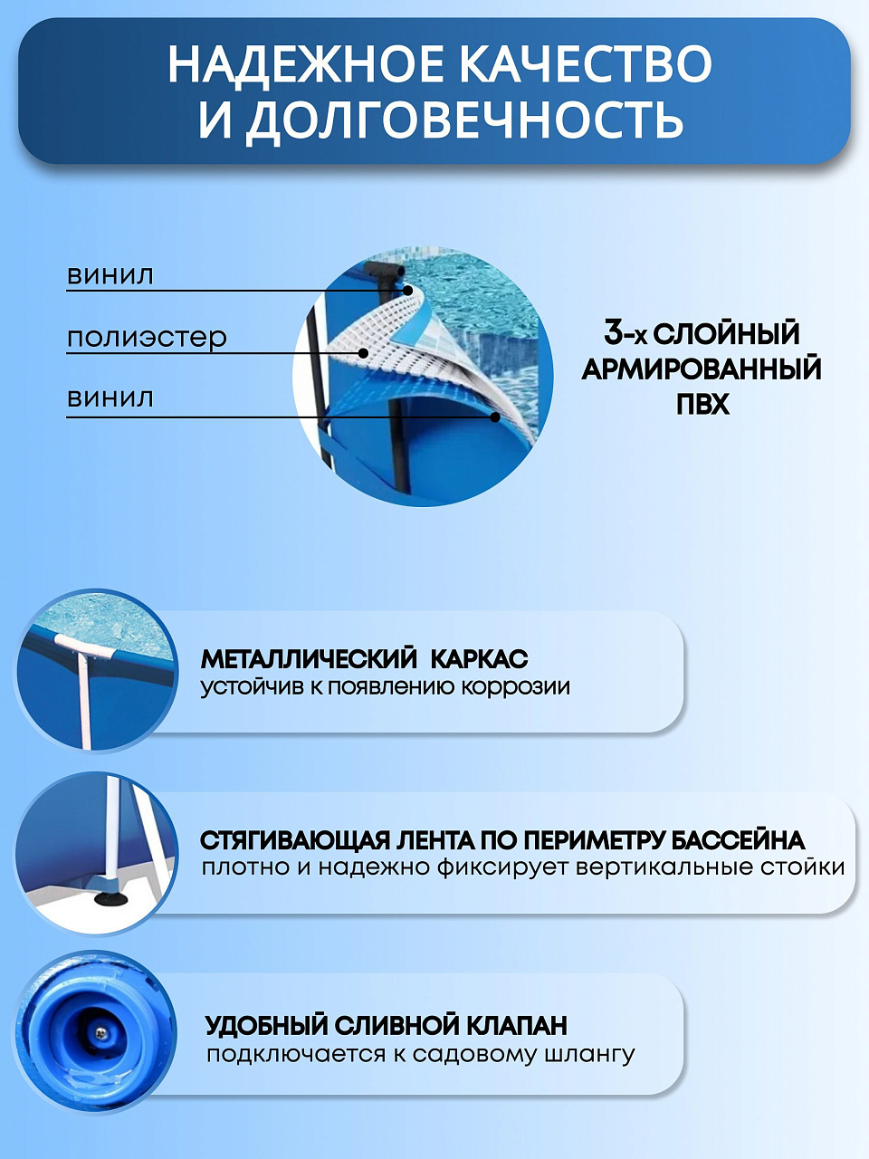 - Удобный сливной клапан: чаша бассейна оснащена сливным клапаном для легкого слива воды.