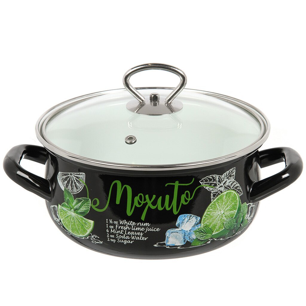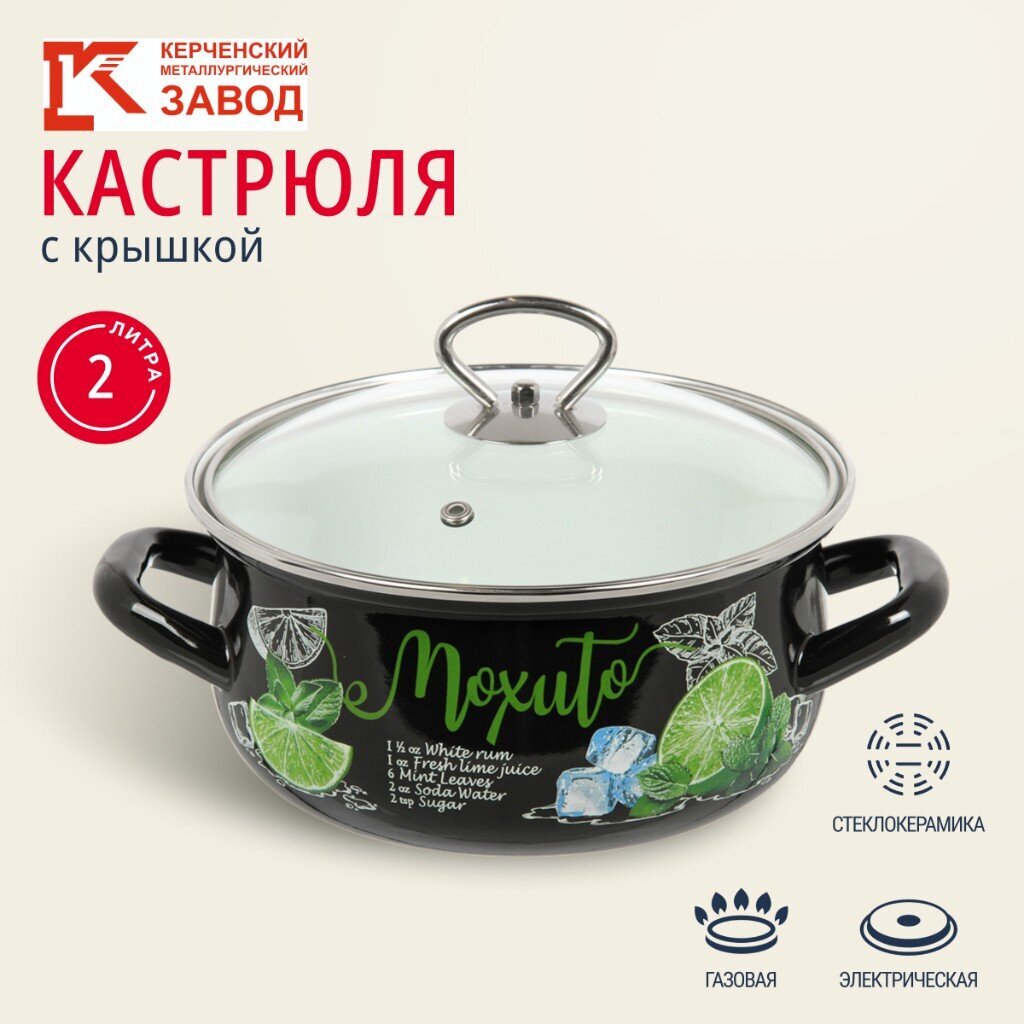 Кастрюля эмалированная Керченский металлургический завод «Мохито», 2 л — долговечное решение для кухни и дачи: сферическая форма, стеклянная крышка с клапаном, стильный декор.