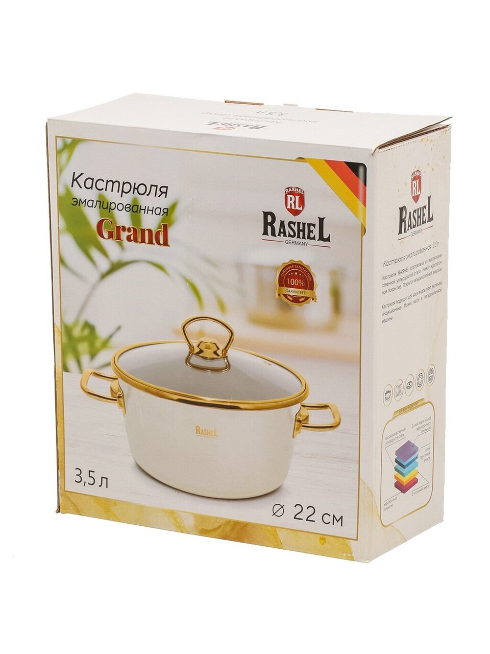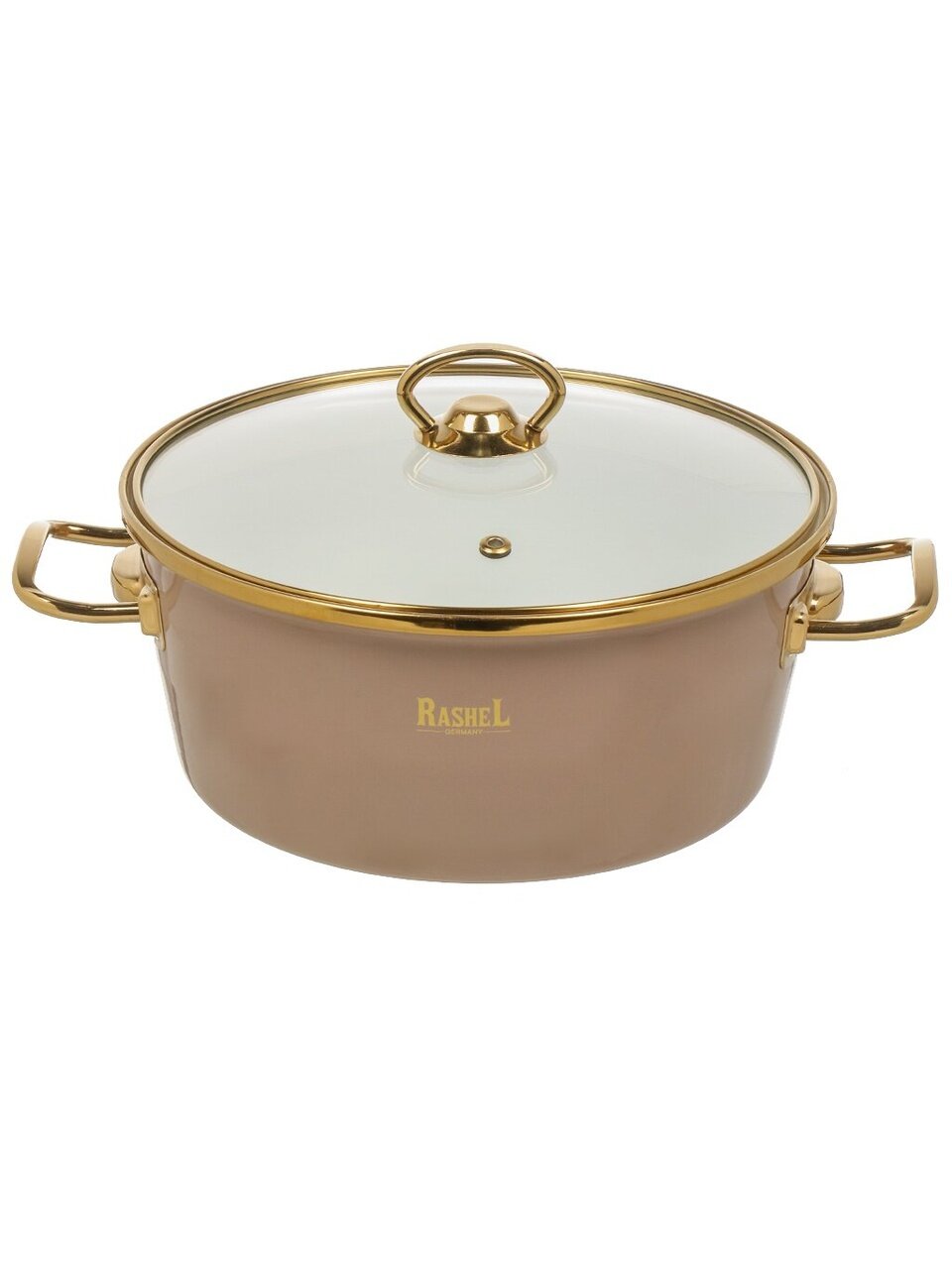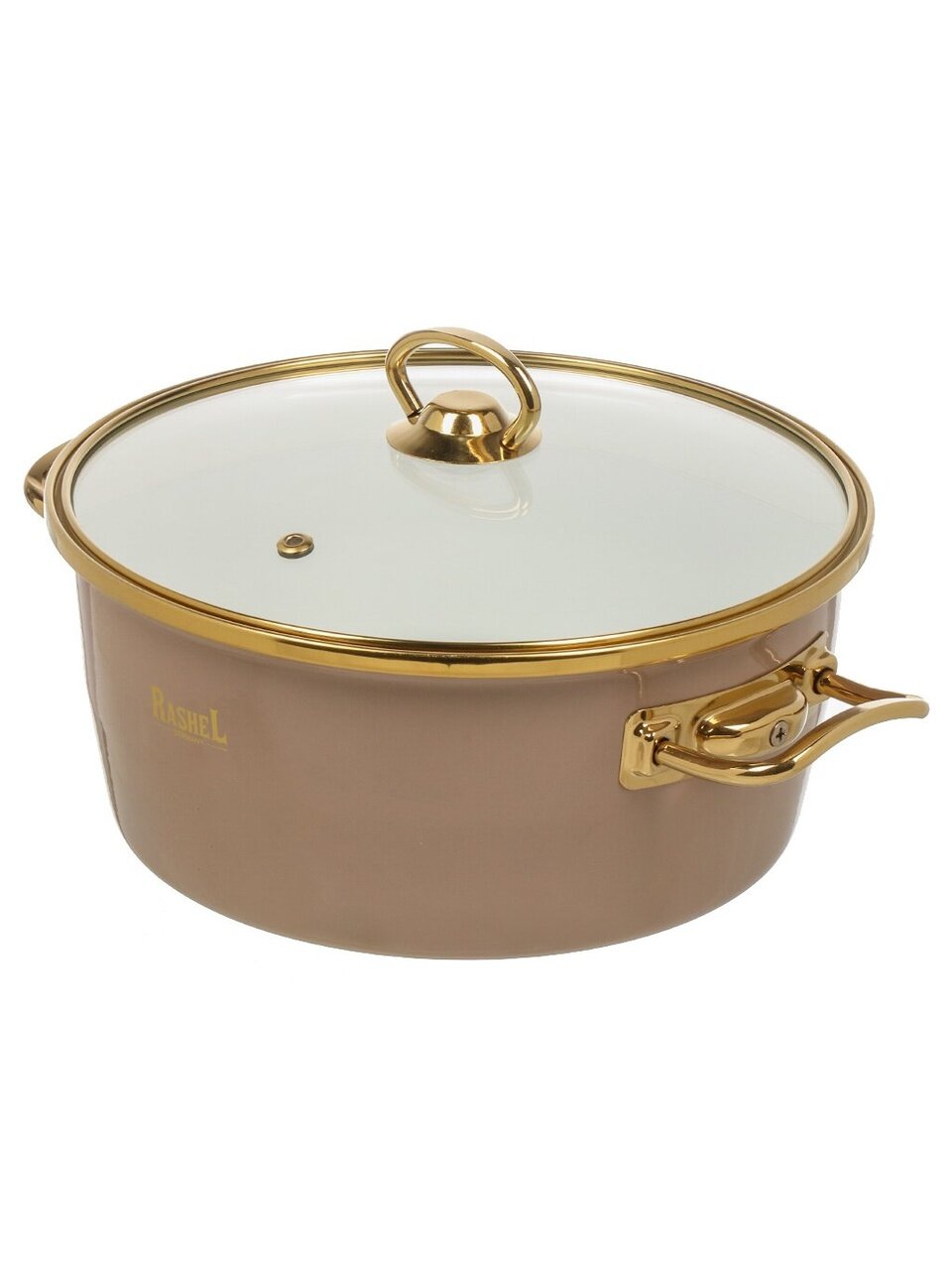 Кастрюля бренда RasheL сделана из высококачественной стали с блестящим эмалированным покрытием внутри и снаружи.