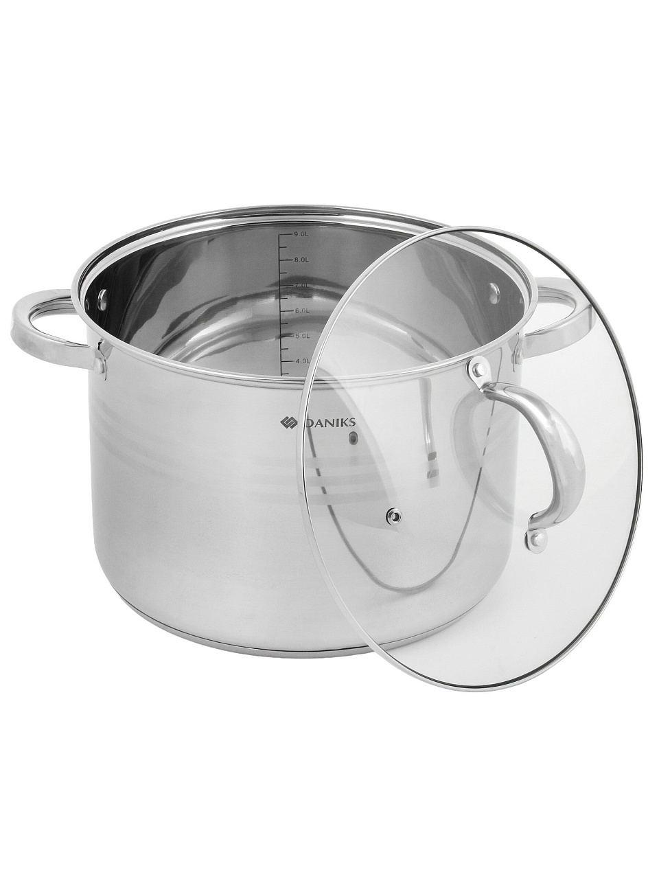 Кастрюля Daniks 10 л из нержавеющей стали с мерной шкалой и стеклянной крышкой — оптимальный выбор для дома, дачи и профессиональной кухни. Готовьте суп, пельмени или макароны без хлопот благодаря универсальной совместимости с индукцией и газом.