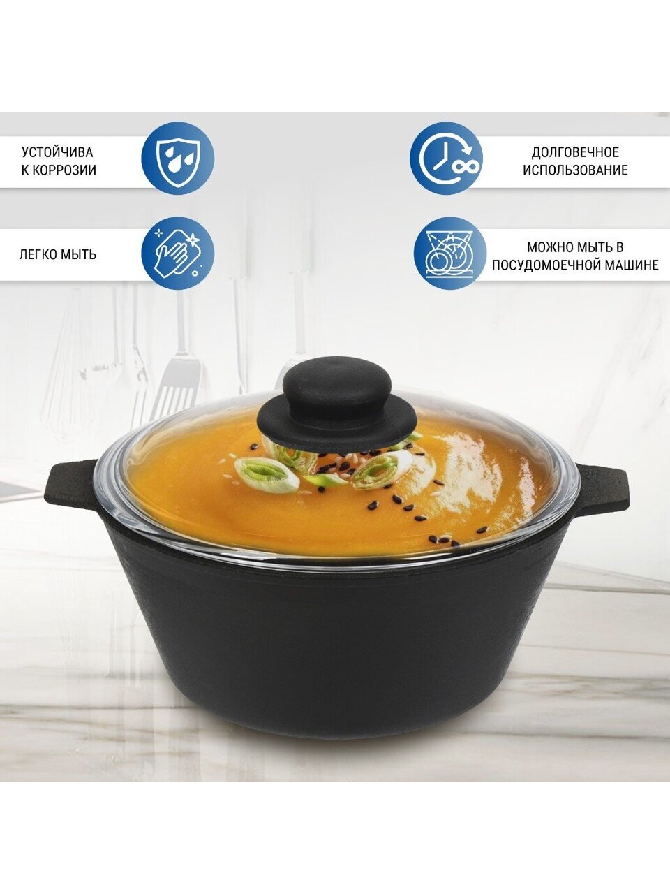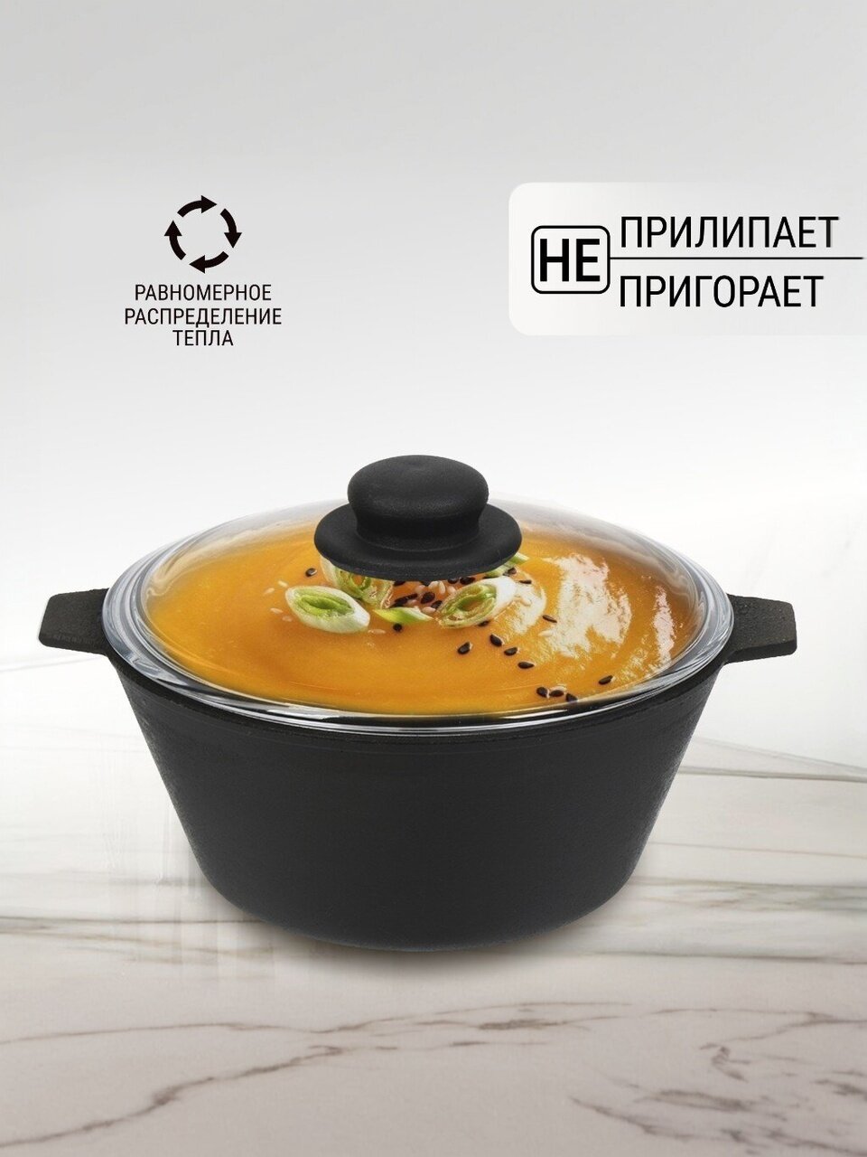 Чугунная кастрюля 2.5 л с крышкой из стекла для индукции — долговечность, идеальный объём и универсальность для домашней кухни и дачи.