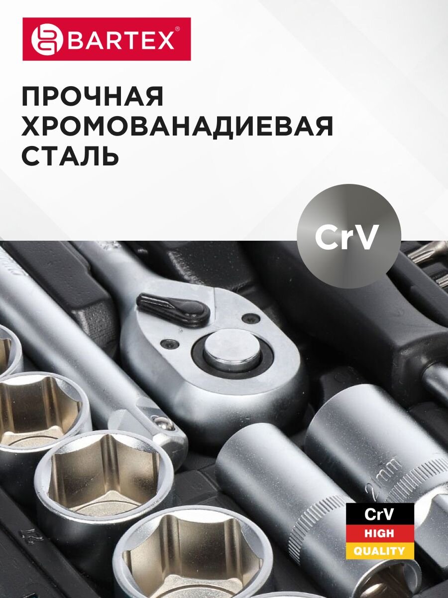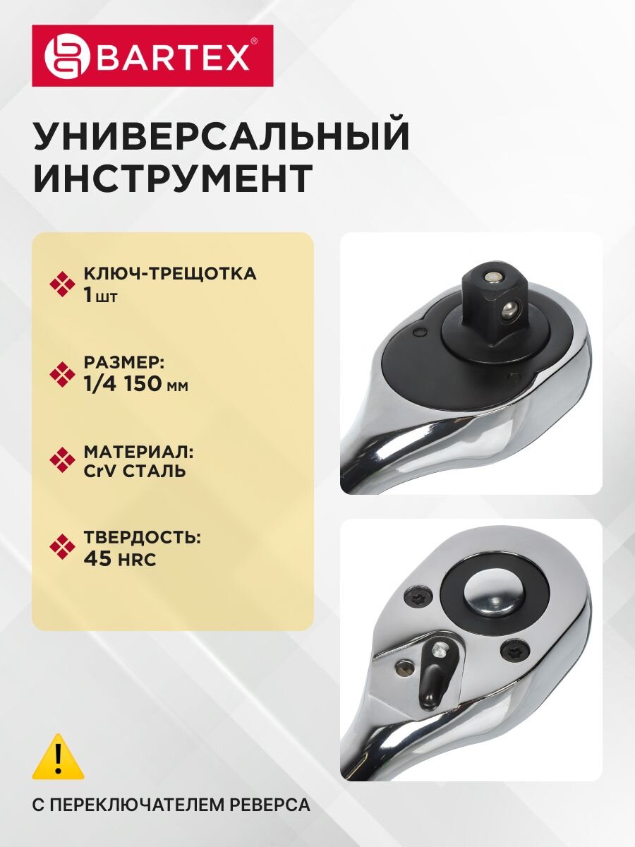 Ключ-трещотка Bartex незаменим при обслуживании автотранспорта, ремонте инженерных систем, монтаже и демонтаже крепежных элементов. Реверс легко переключается флажковым механизмом. Ключ позволяет как откручивать, так и закручивать гайку при помощи реверсивного устройства, не снимая его со сменной головки.