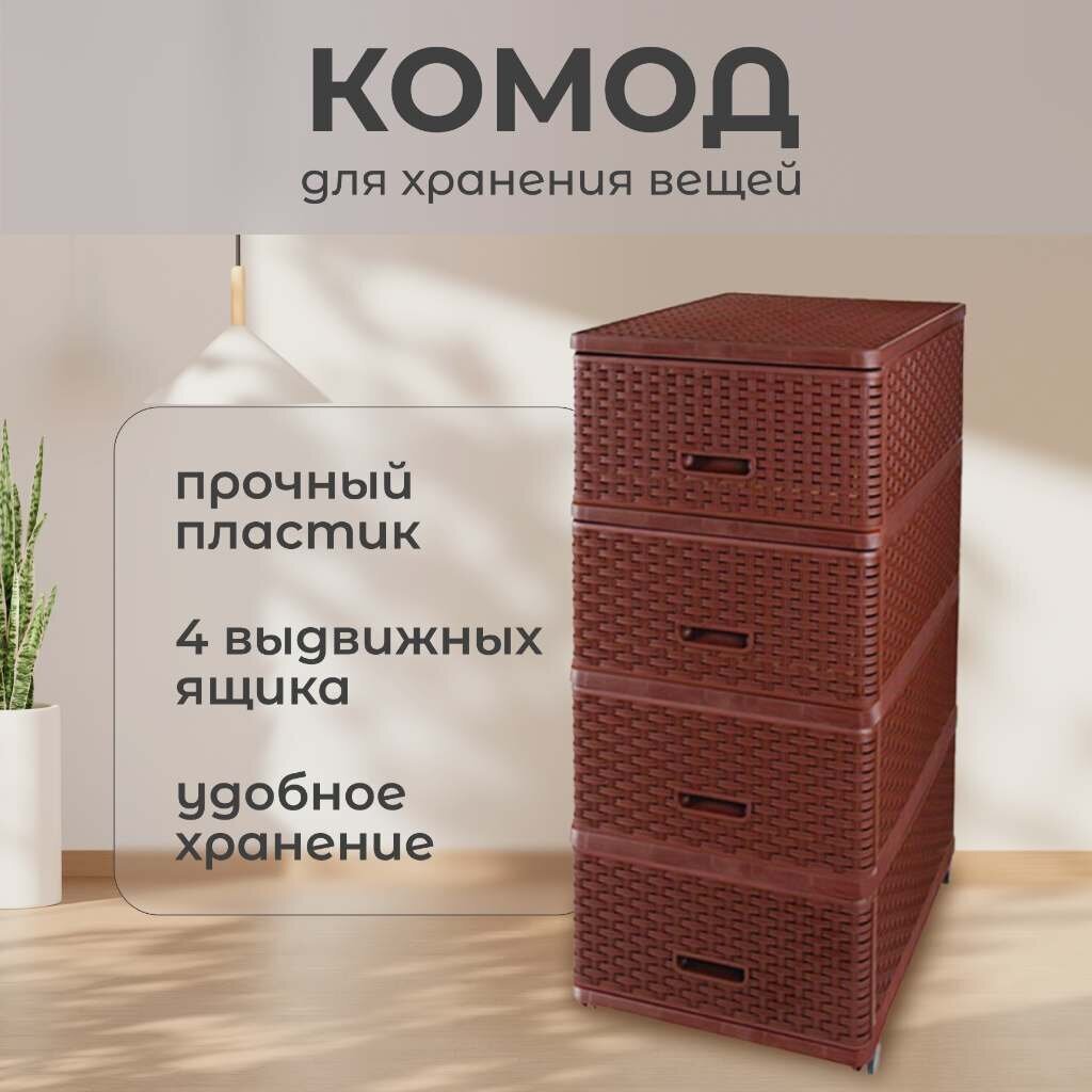 Комод 4 ящика Дюна 40х50х98 см — практичное и стильное решение для хранения вещей в любом современном интерьере. Благодаря компактным размерам и узкой форме комод идеально впишется даже в ограниченное пространство, позволяя организовать порядок в доме или на даче. Коричневый цвет и плетеная фактура фасадов придают изделию актуальный внешний вид, который легко сочетается с различными стилями оформления помещений. Прочный пластик обеспечивает долгий срок службы, устойчив к влаге и легко очищается, что особенно важно для ежедневного использования.