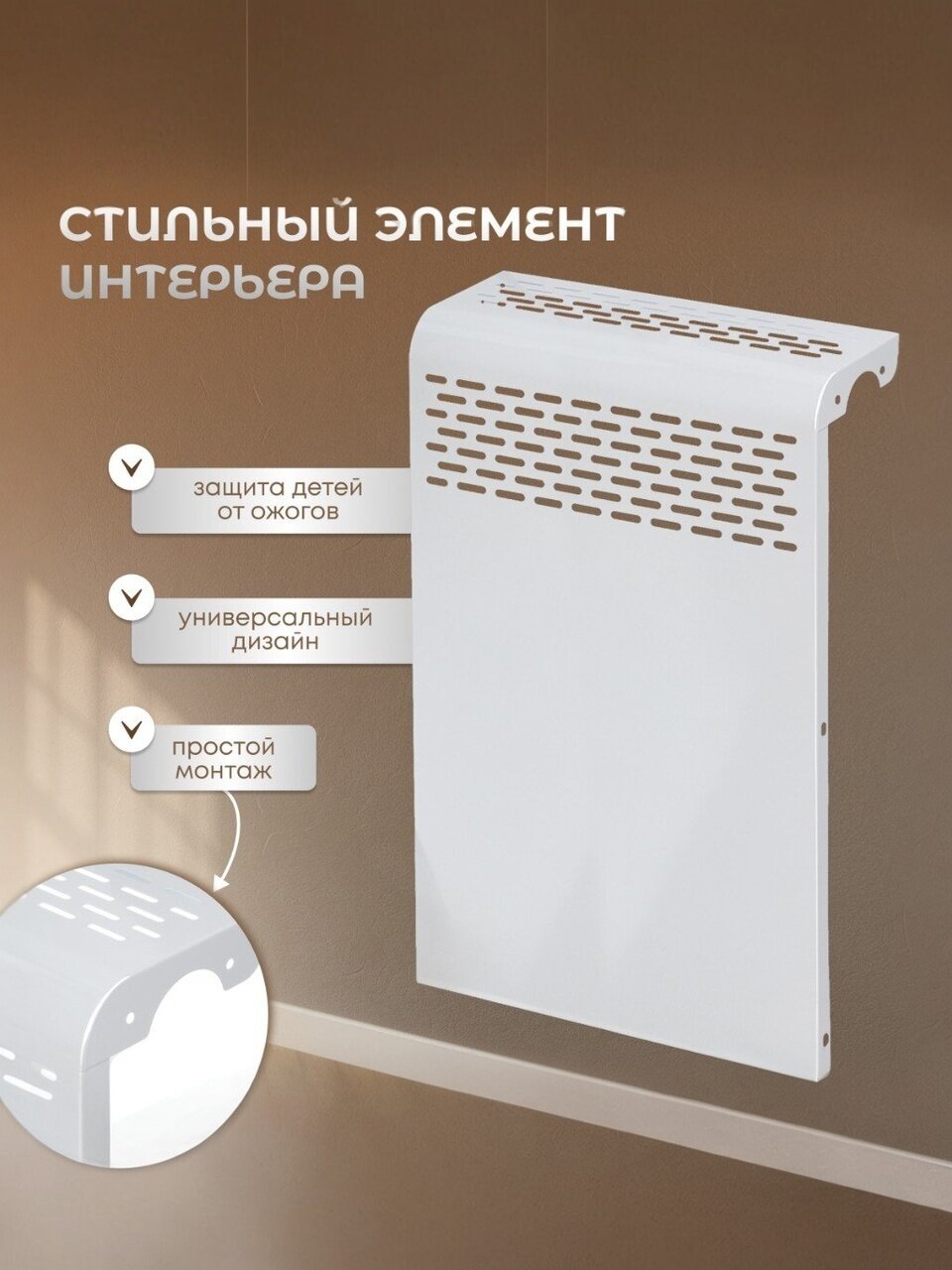 Металлический экран для радиатора - это функциональный и стильный элемент интерьера, который предназначен для защиты радиаторов отопления от пыли и грязи, а также для улучшения внешнего вида помещения. Конструкция очень просто монтируется и благодаря классическому цвету будет органично смотреться как в доме, так и в офисном пространстве.