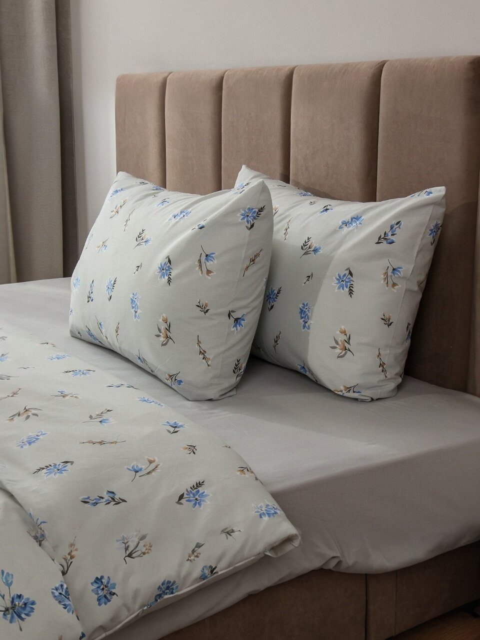 - Натуральный хлопок-поплин: оптимальный размер пододеяльника 200х215 см и 2 наволочки 50х70 для семейной кровати.