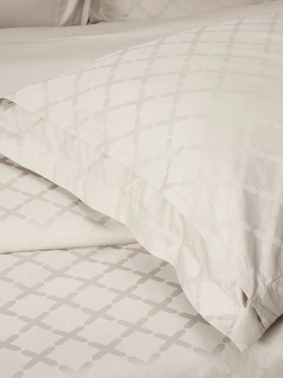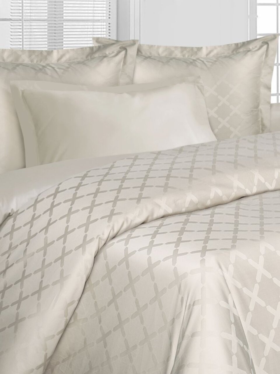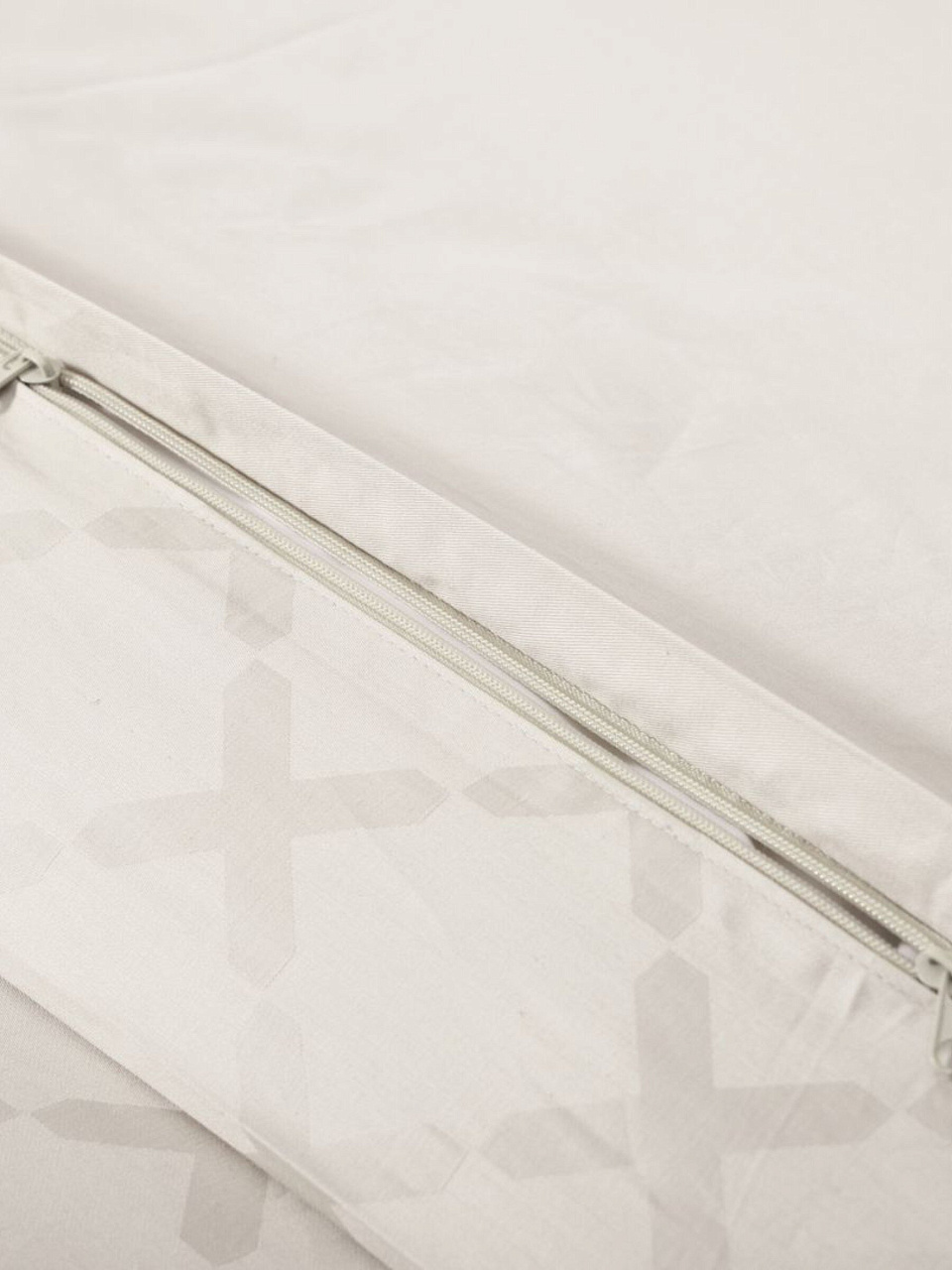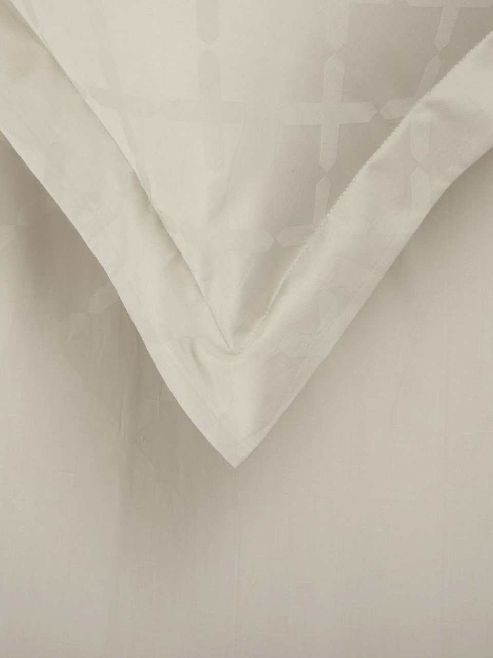 Ткань — 100% хлопок, сатин-жаккард. Комплект состоит из 6 предметов: простыня, пододеяльник на молнии, 4 наволочки (2 — 70х70 см, 2 — 50х70 см). Цвет — молочный, дизайн однотонный.