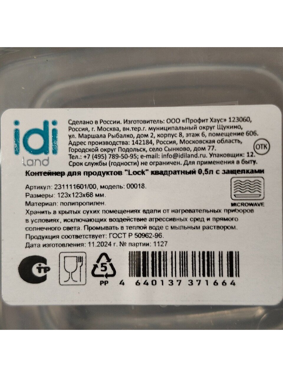 Контейнер пищевой пластиковый 0.5 л IDIland Lock — компактное хранение продуктов, герметичность и долговечность по доступной цене.