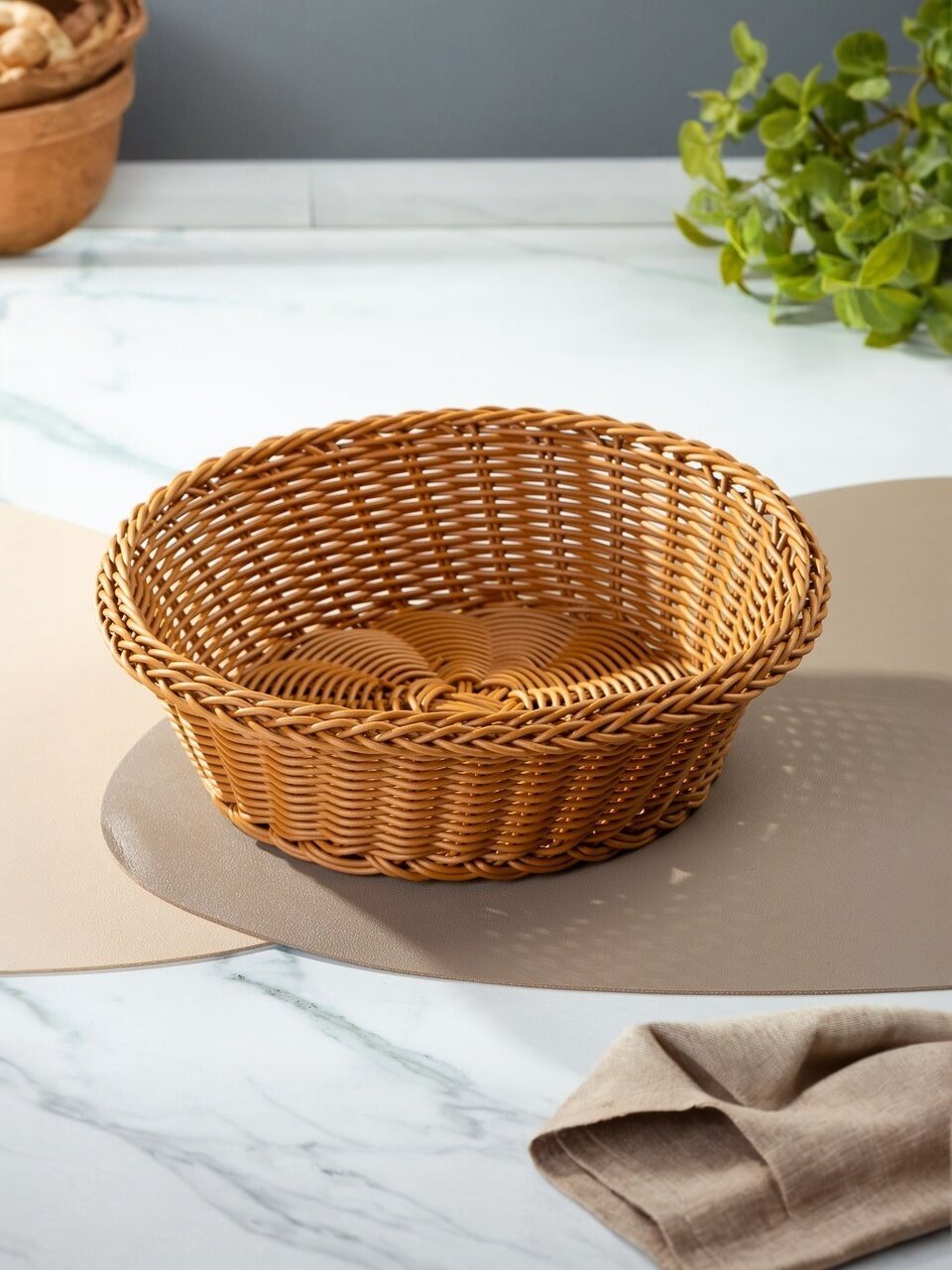 Откройте для себя изысканность и стиль с декоративной корзиной 25х8 см, которая станет идеальным акцентом в вашем интерьере. Эта круглая плетеная корзина из полимера в бежевом цвете прекрасно впишется в любой декор, добавляя уют и функциональность.
