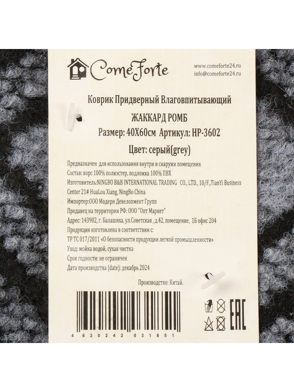 Вы можете приобрести «Коврик грязезащитный влаговпитывающий, 40х60 см, прямоугольный, полиэстер, ПВХ, серый, ромб, Жаккард , ComeForte» и другие товары в нашем интернет-магазине в Обнинске по низким ценам и с бесплатным самовывозом.