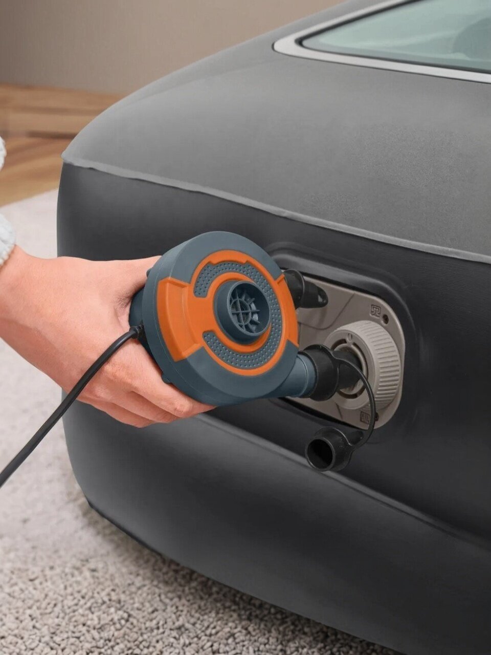 - Матрас можно надуть за короткое время, просто подключив его к источнику питания и нажав кнопку.