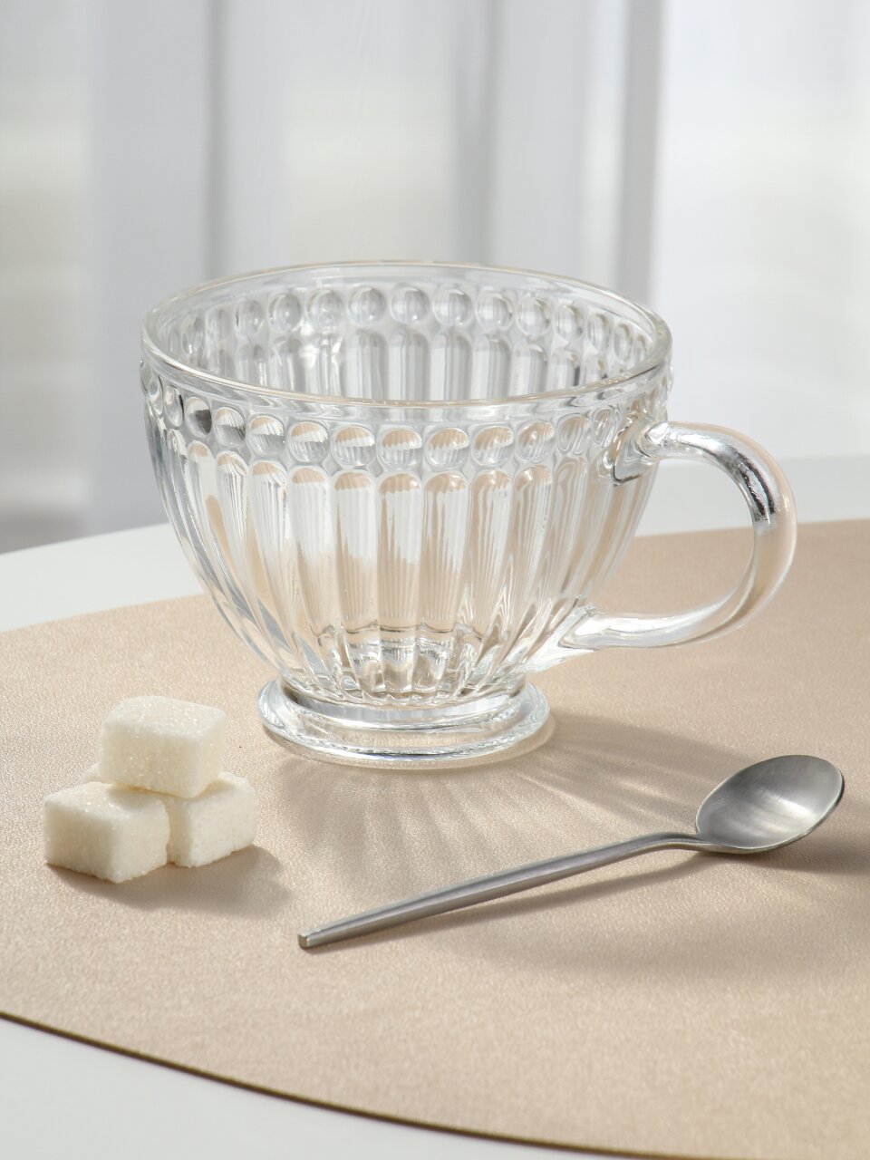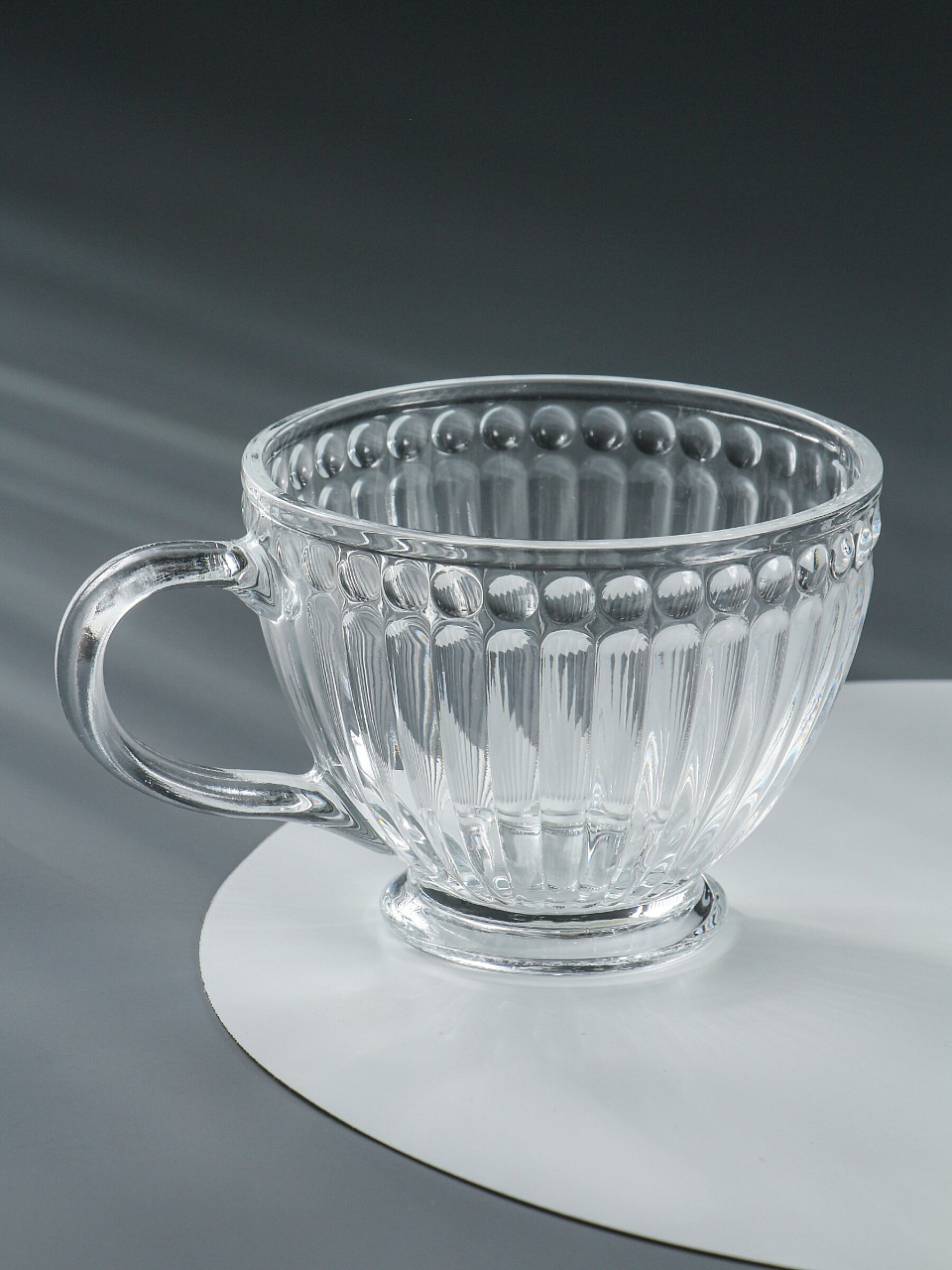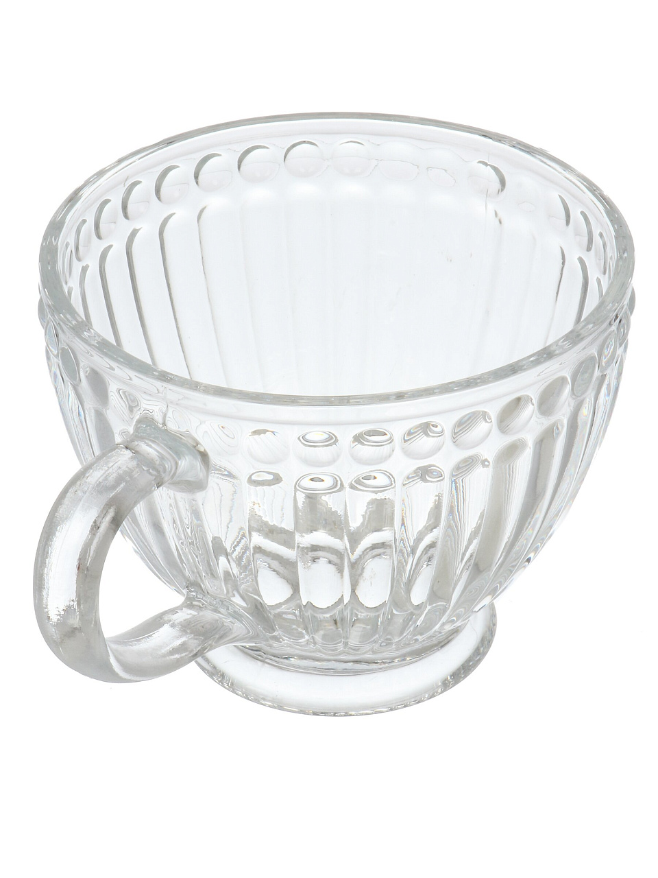 Объём — 420 мл, материал — прозрачное стекло без эмали, дизайн — рельефный узор, подходит для ежедневного использования и подарка.