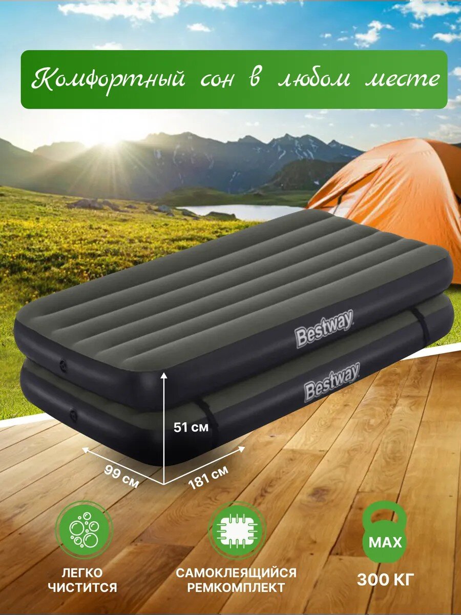Матрас Bestway, выполненный из прочного флокированного винила, обеспечивает комфортный и здоровый сон в любых условиях. Его уникальная конструкция позволяет ему сохранять форму даже при неравномерном распределении нагрузки. Этот матрас легко надувать и сдувать, что делает его прекрасным выбором для путешествий или отдыха на природе. Кроме того, он может служить дополнительным спальным местом в квартире или доме. Если пространство ограничено, надувные матрасы становятся отличным решением для размещения гостей. Всё, что нужно сделать, - это надуть матрас и разместить его в свободной комнате.