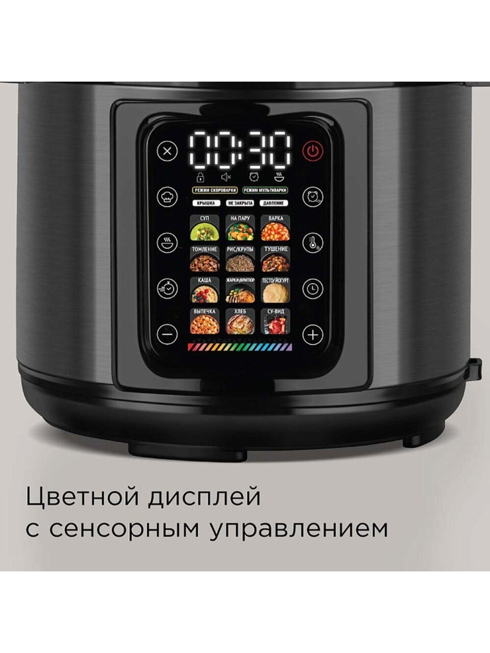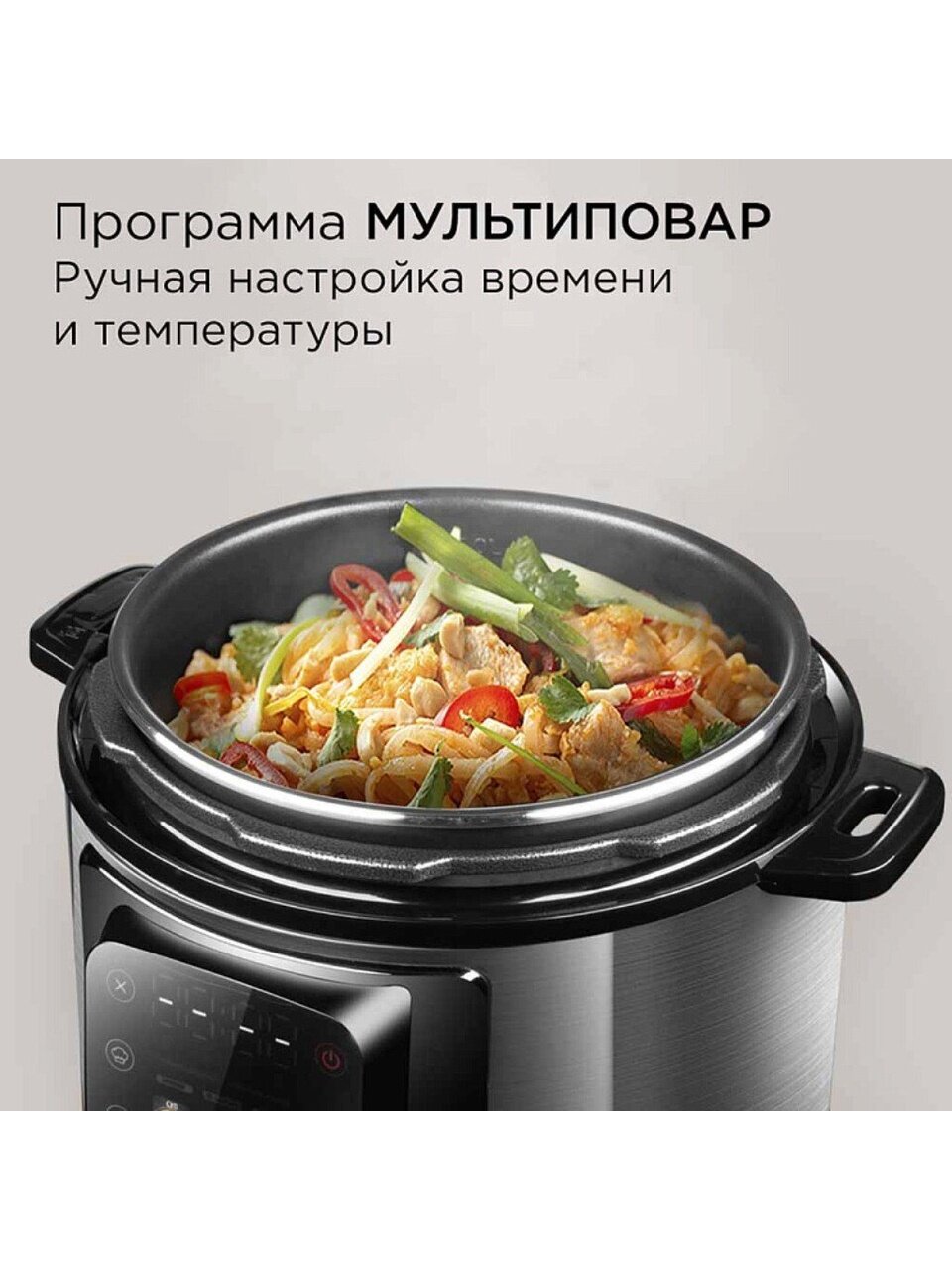 Устройство оснащено 14 программами, среди которых: варка, тушение, жарка, приготовление под давлением, медленноварка, скороварка, экспресс-режим, фритюр, хлебопечка, приготовление супов, каш, круп, йогурта, выпечка, пароварка, стерилизация и мультиповар. Благодаря антипригарному покрытию чаши блюда не пригорают, а уход за прибором становится максимально простым. Таймер, функция отложенного старта и поддержание температуры позволяют готовить блюда к нужному времени, не тратя лишних усилий.