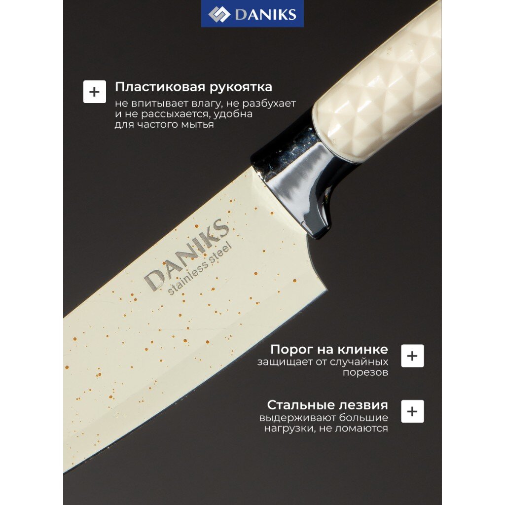 Стильный набор ножей Daniks YW-A454-PB — идеальное решение для современной кухни и отличный подарок для ценителей функциональности и эстетики. Белый цвет и элегантная подарочная упаковка делают комплект привлекательным для любого интерьера, а прочные материалы гарантируют долгий срок службы. Набор включает пять ножей и овощечистку, что обеспечивает универсальность использования: от нарезки хлеба до чистки овощей. Эргономичные пластиковые рукоятки обеспечивают удобство и безопасность при работе, а лезвия из нержавеющей стали сохраняют остроту даже при интенсивном использовании.