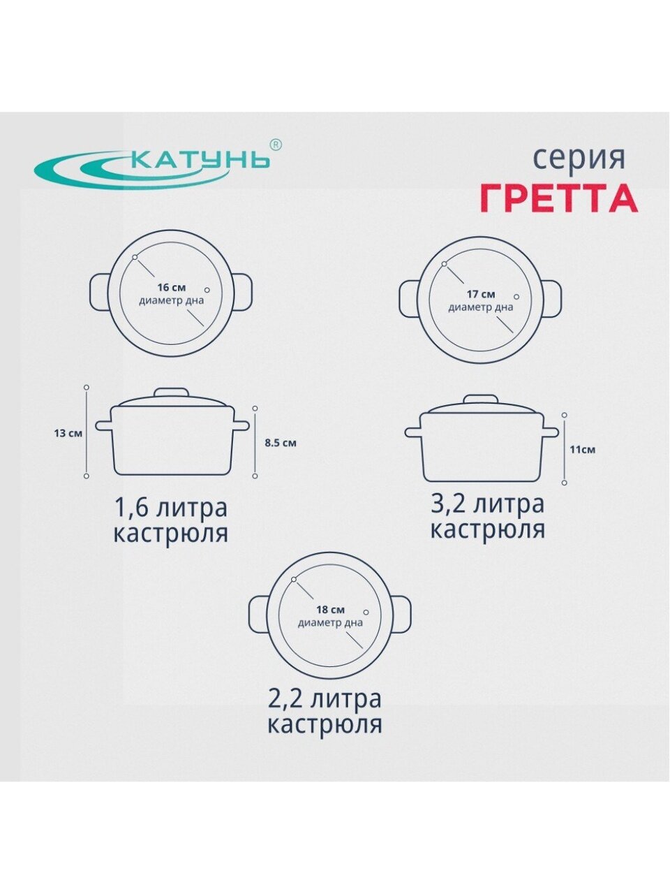 В комплекте три кастрюли: 1.6, 2.2 и 3.2 литра. Меньшая подходит для соусов и гарниров, средняя — для супов, большая — для тушения и варки на семью.