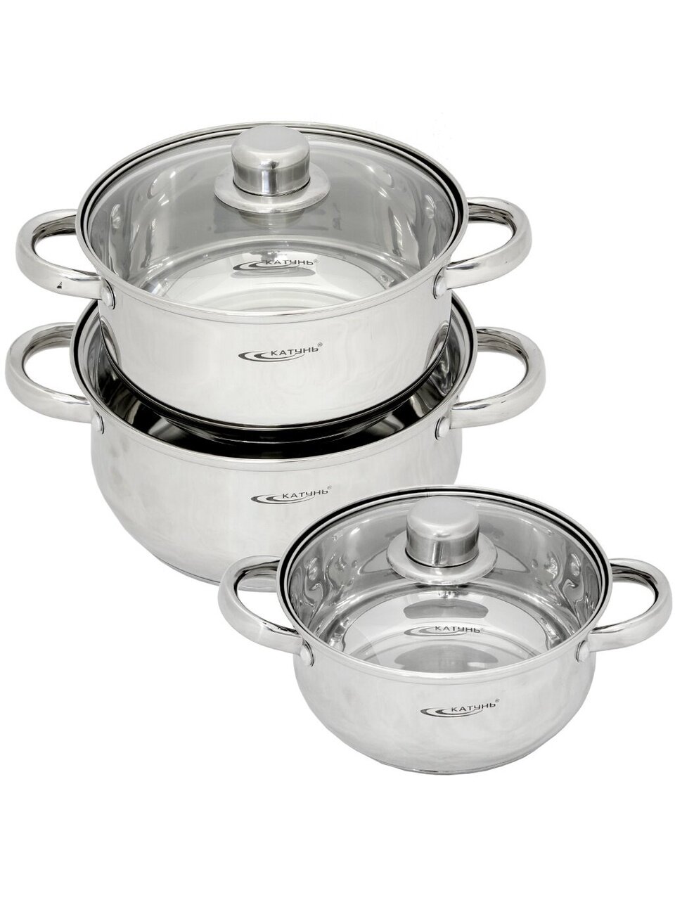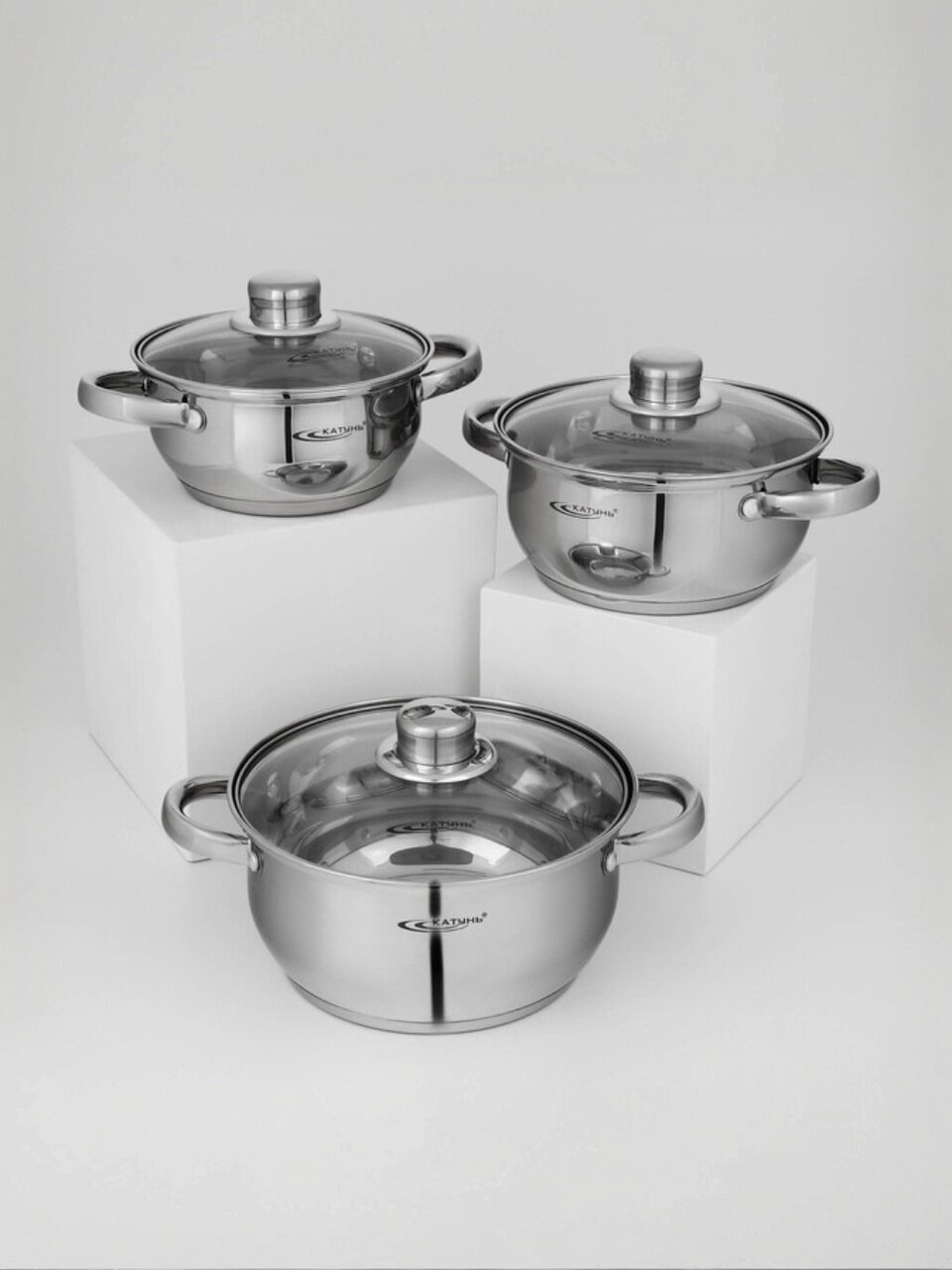 Набор посуды из нержавеющей стали Катунь Гретта 6 предметов — универсальное решение для дома, дачи и подарка: подходит для индукционных плит, долговечен, легко мыть.