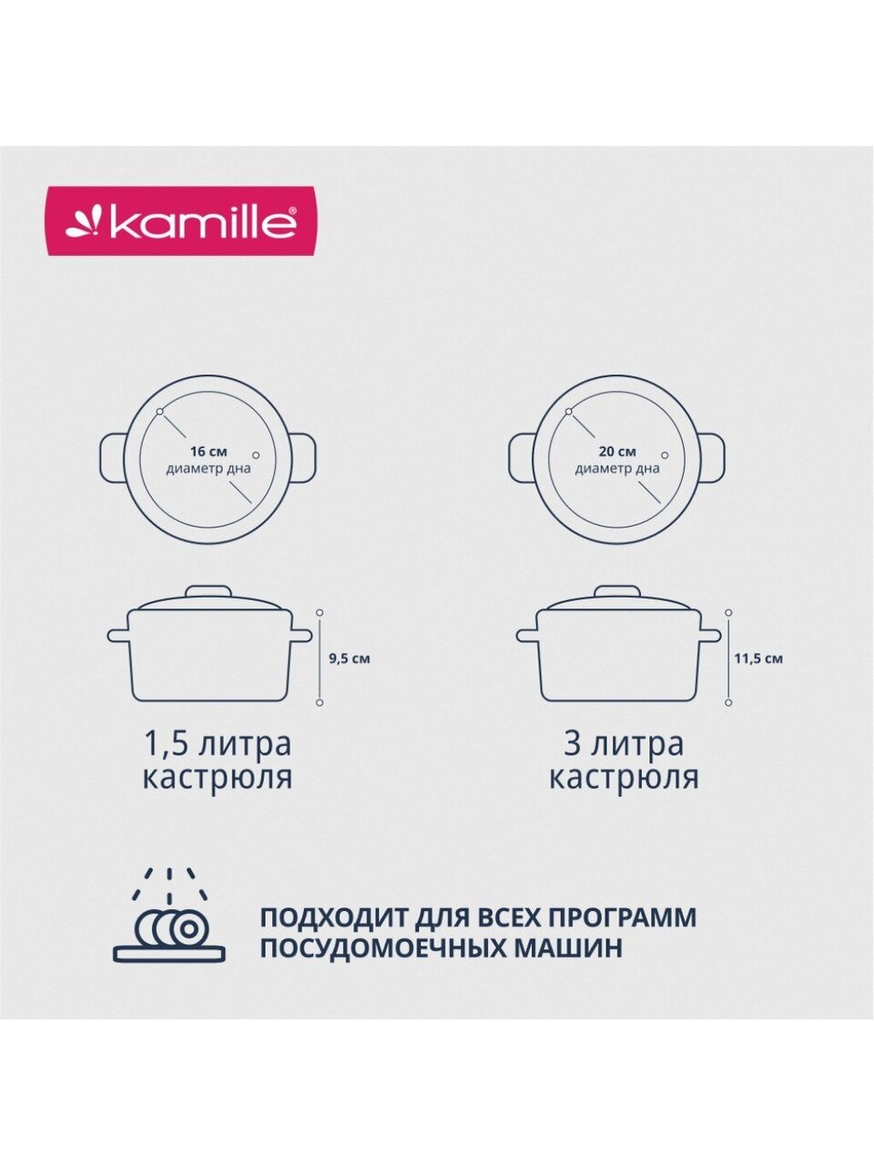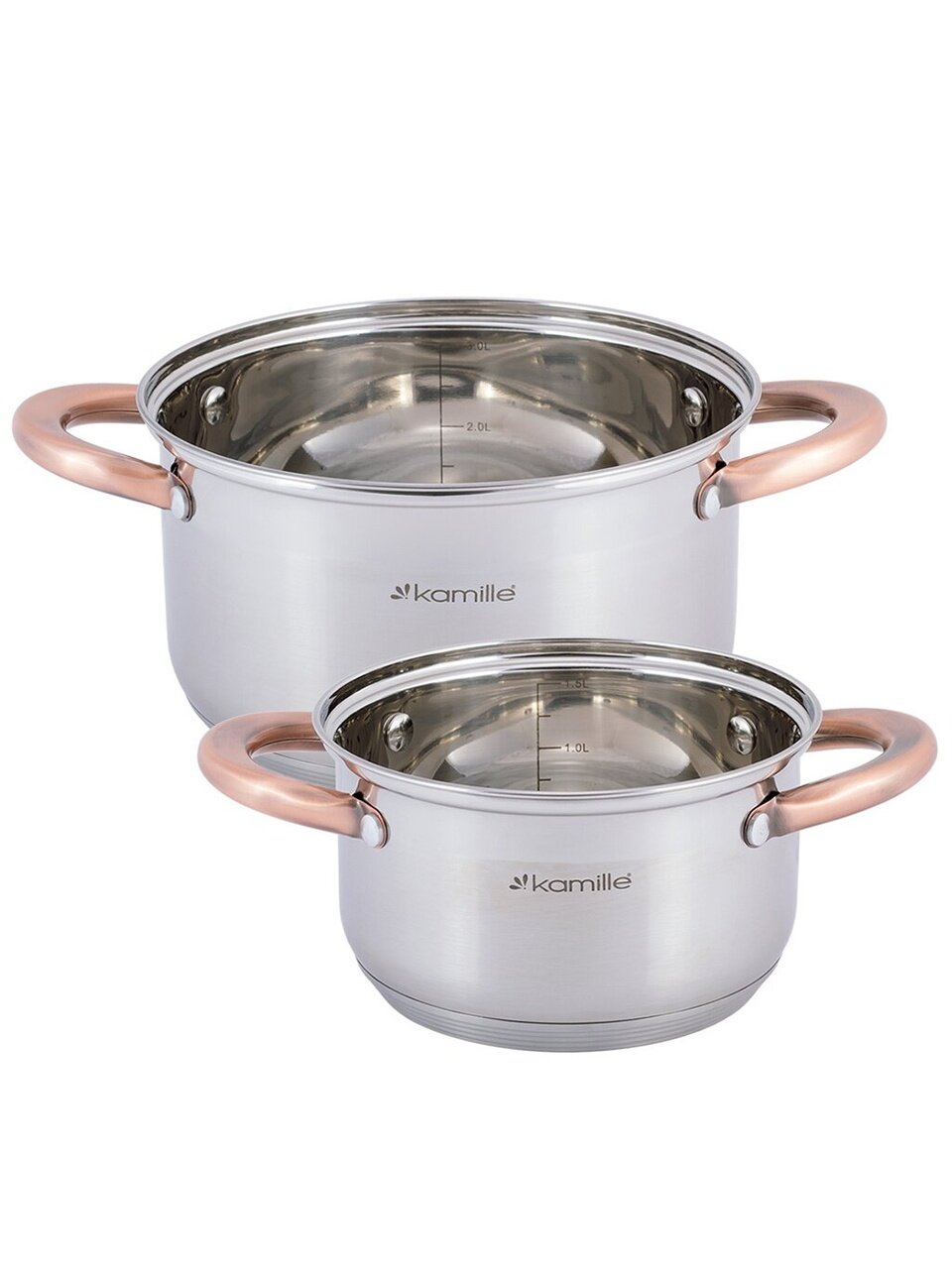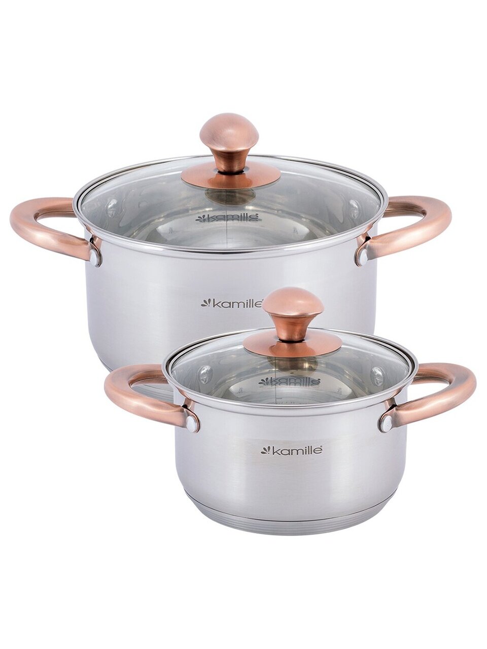Набор посуды Kamille 4935 — это практичный выбор для тех, кто ищет, какую посуду выбрать для индукционной плиты или как подобрать универсальный комплект кастрюль. Корпус из нержавеющей стали гарантирует долгий срок службы, не впитывает запахи и легко очищается. В наборе две кастрюли (1.5 и 3 литра) с прозрачными стеклянными крышками, что удобно для контроля процесса приготовления.