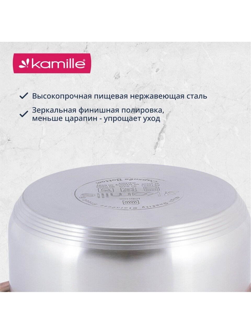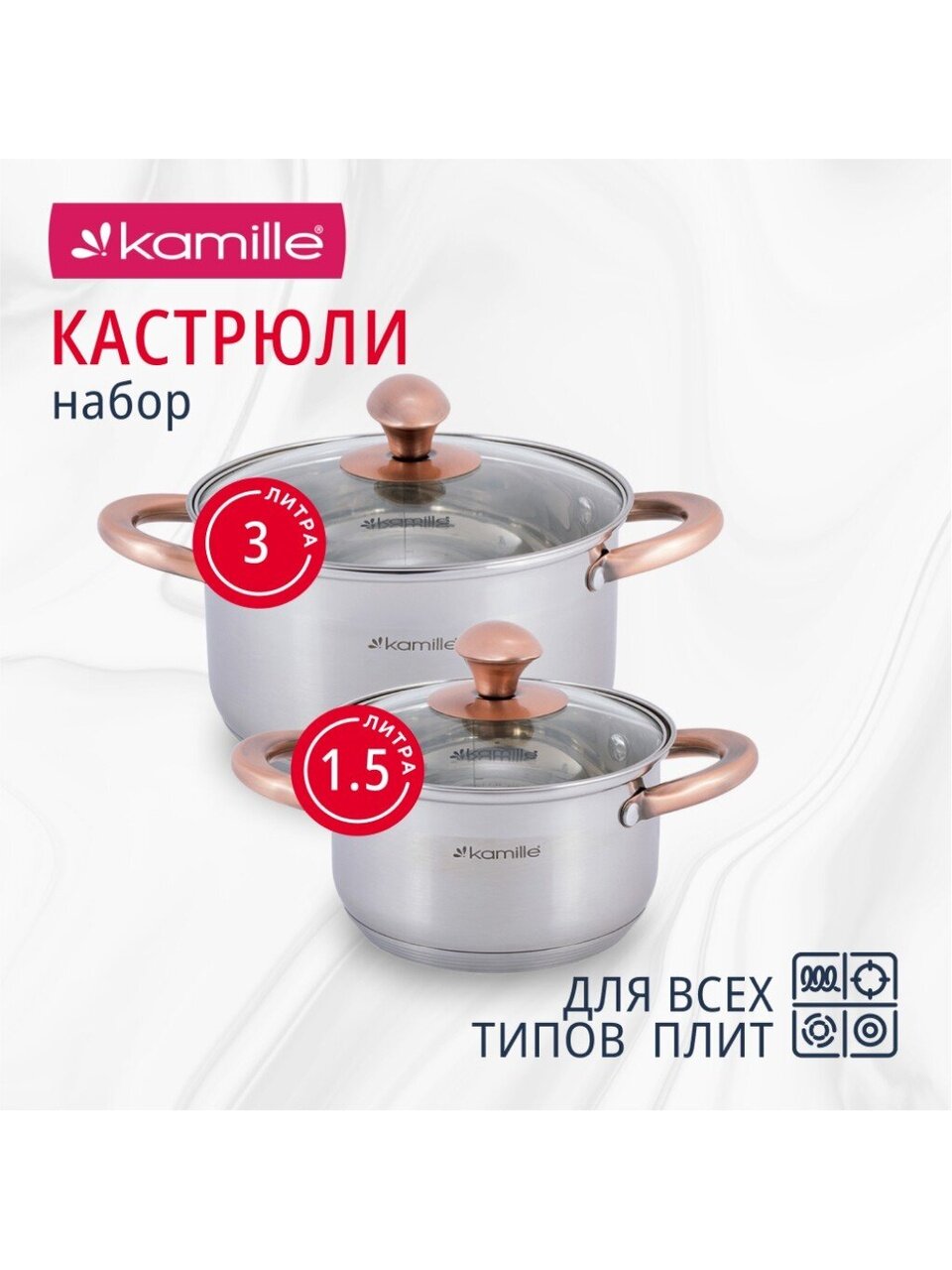 Да, кастрюли Kamille 4935 совместимы с индукционными, газовыми, электрическими и стеклокерамическими плитами благодаря специальному дну из нержавеющей стали.