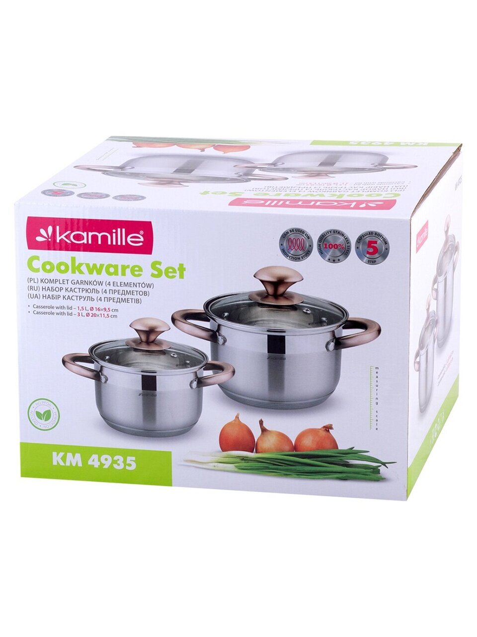 Набор Kamille 4935 — это выбор для тех, кто хочет купить недорого набор кастрюль для дачи или дома, не жертвуя качеством. Закажите сейчас и получите универсальную посуду, которая прослужит долгие годы.