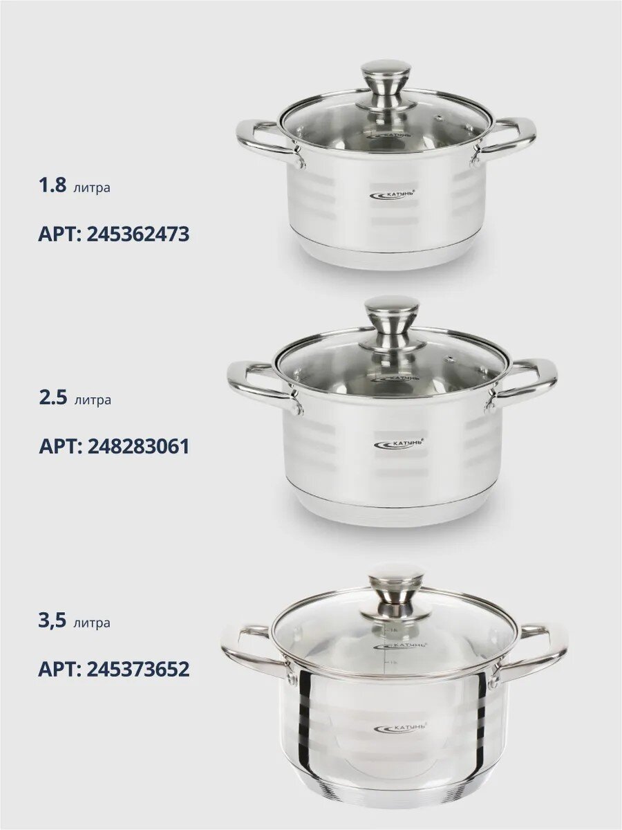 - Практичные объёмы — кастрюли 1,8, 2,5 и 3,5 л из долговечной нержавеющей стали с прочными стеклянными крышками