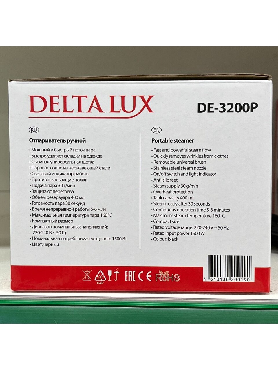 Вы можете приобрести «Отпариватель Delta Lux, DE-3200P, 1500 Вт, 0.4 л, ручной, черный» и другие товары в нашем интернет-магазине в Старом Осколе по низким ценам и с бесплатным самовывозом.
