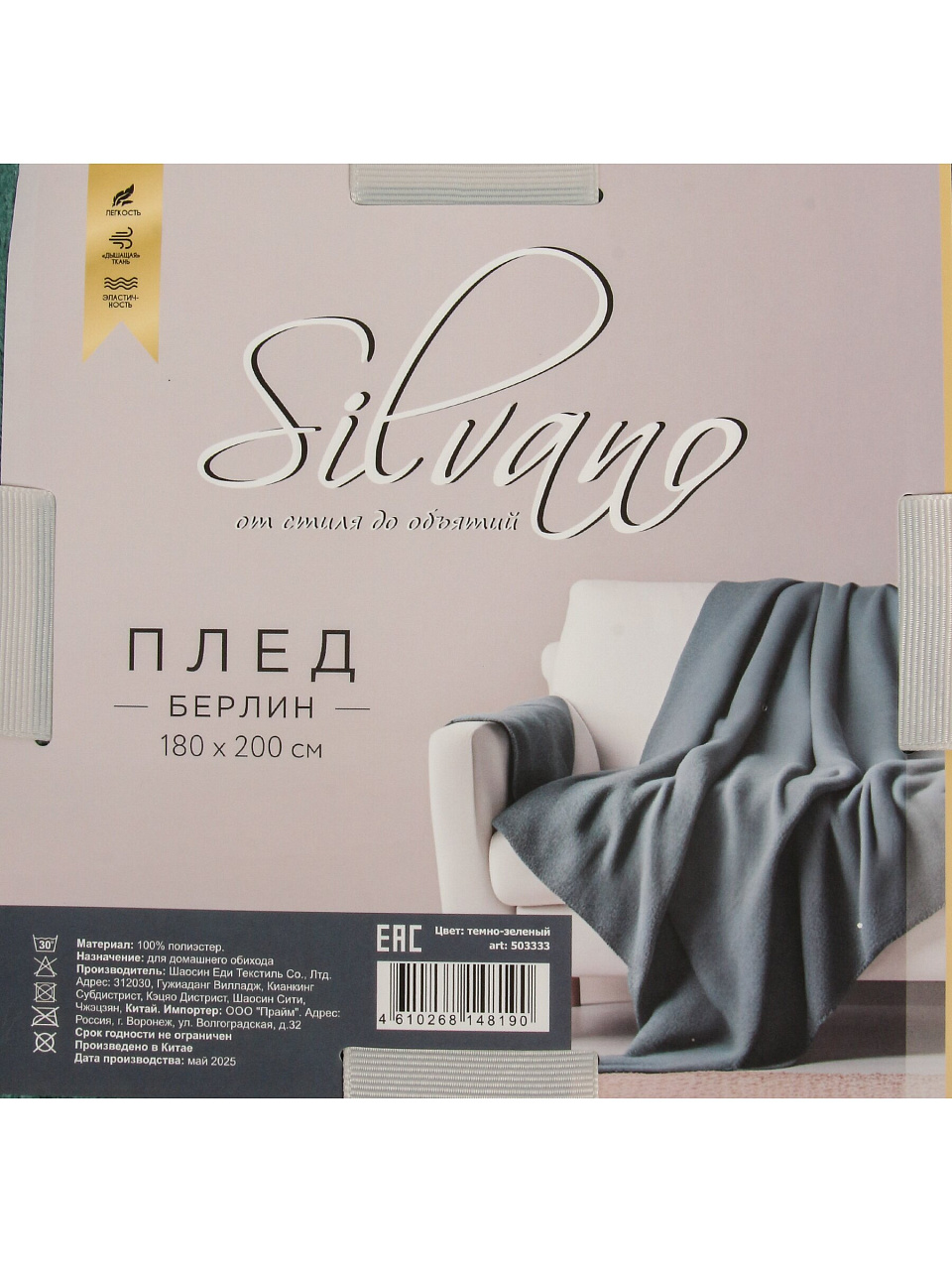 Плед 180х200 см, микрофибра, 100%пэ, 280г, Silvano, Берлин, темно-зеленый